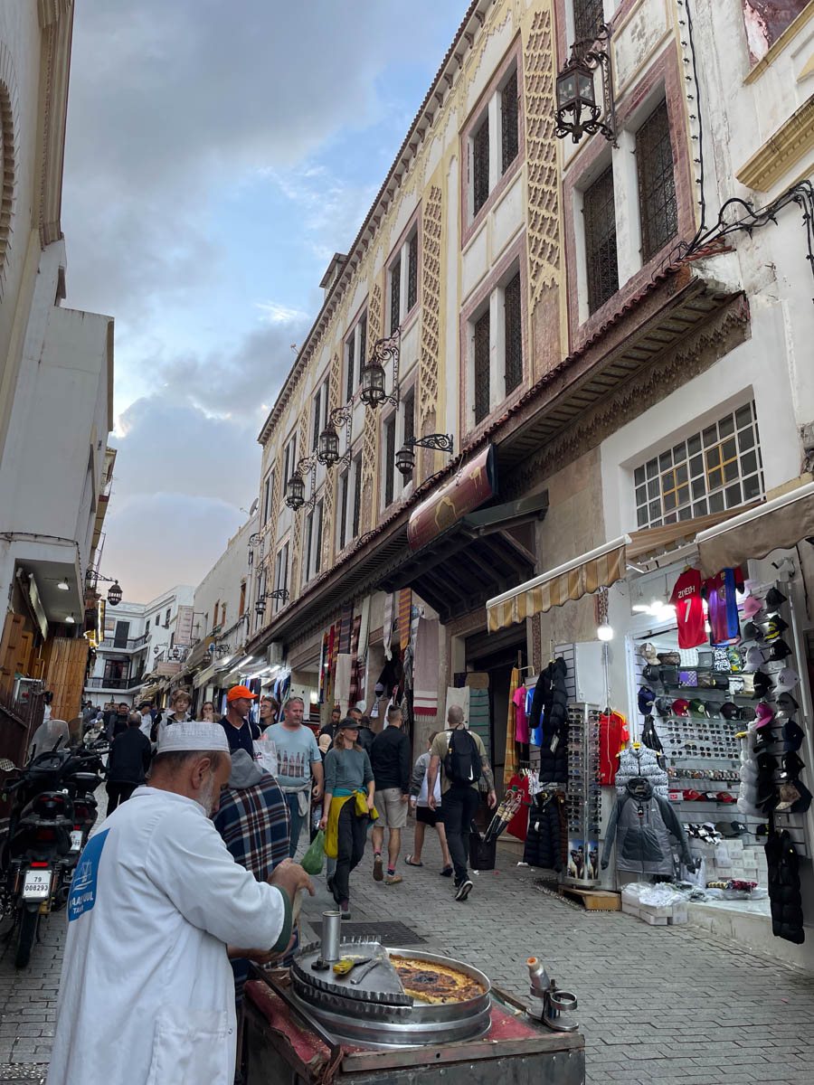 Jeudi 31 octobre nous avons rendez-vous avec l’équipage de Keep Cool et Apsara pour visiter la vieille ville de Tanger. Nous commençons d’abord par déambuler dans le souk, grand marché couvert. En premier c’est le bâtiment des poissonniers avec des étals en béton où les hommes découpent poissons et crustacés, les têtes de poissons et crevettes sont jetées directement au sol… l’odeur est forte et on ne s’attarde pas. Ensuite c’est le bâtiment des bouchers, là encore chaque échoppe découpe devant nous les quartiers de viande suspendus à des crochets à l’air libre. Plus loin les épices et olives dégagent des odeurs plus agréables. On finit par la partie avec les fruits et légumes et les pains, Dennis achète un panier garni de très beaux légumes pour 8€, on reviendra assurément faire notre marché ici.