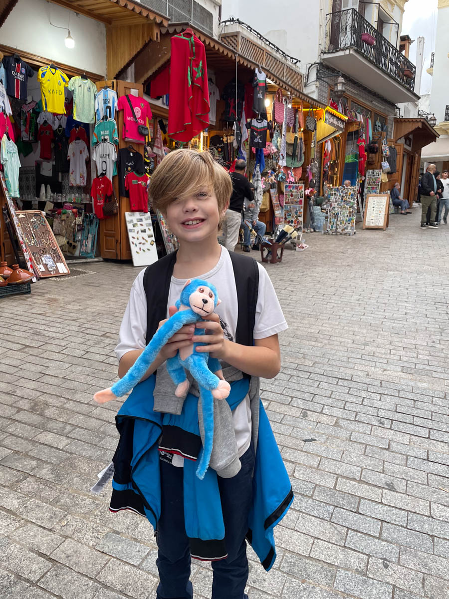 Nous entrons à présent par la porte arabe qui marque l’entrée de la médina. Ce quartier est constitué de minuscules rues bordées d’innombrables boutiques d’artisanat et de vêtements (de contrefaçon ? sans doute fabriqués en Chine pour la plupart et transportés par les grands cargo que nous avons croisés). Martin trouve alors un singe en peluche qu’il espérait depuis Gibraltar, il est ravi de sa trouvaille ! Nous déambulons à travers les rues qui se ressemblent toutes peuplées de touristes et de marchands ambulants ; en cherchant à descendre, on retrouve facilement le chemin du restaurant de la veille. Une petit arrêt là la pâtisserie marocaine s’impose pour retrouver des forces pour le chemin du retour jusqu’au bateau tout au bout du port.