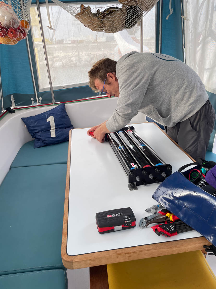 Lundi 4 novembre, la livraison des courses arrive. Antoine doit emprunter une trotinette électrique de nos voisins pour aller jusqu’au bureau de la marina pour trouver une solution pour faire livrer les courses jusqu’au bateau. Finalement, la camionnette ne sera autorisée qu’à accéder jusqu’au poste de garde à l’entrée de la jetée et il faudra faire appel à une voiturette du port, conduite par Walid, où les livreurs transférerons chaque sac, avec contrôle systématique du contenu par le garde. Walid nous amènera ensuite les courses au bout du ponton. Après une petite chaîne humaine avec le chariot pour tout amener à bord, il faut maintenant trouver des rangements pour les 5 packs de lait, 96 œufs, 8 kg de farine, 4 kg de sucre, des pâtes, du riz et de la semoule et des conserves pour tenir un siège. On profite des courses de produits français livrés à domicile pour faire un plein qui pourrait bien tenir jusqu’à l’arrivée de la transat car on ne sait jamais où et comment seront les supermarchés sur notre route.