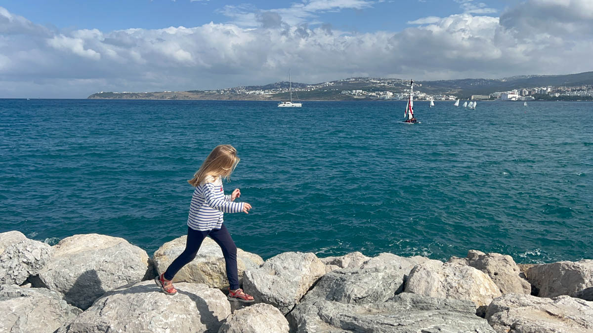 Dimanche 3 novembre, c’est grasse matinée au bateau. Une fenêtre météo se profile peut-être pour mardi alors Magali fait une commande au Carrefour en ligne. Tout sera livré lundi midi sur le bateau. Les enfants passent de bateau en bateau pour jouer tous ensemble, Antoine et Magali profitent de cette occupation joyeuse et surveillée pour aller visiter la kasbah en amoureux. Nous décidons de traverser à l’aventure les ruelles de la médina pour grimper en haut de la colline, seulement guidés par le relief. En effet, les anciens bâtiments du pouvoir royal y sont regroupés dans des fortifications avec une belle vue sur la mer. Nous rentrons à la nuit tombée au bateau et pouvons dîner de bonne heure pour que les 3A regardent un film Marvel et les 3M s’affrontent sur les épreuves de sport de la switch. Nous nous essayons au golf et avons une pensée pour Catherine qui parfait son swing en Turquie au même moment 😉