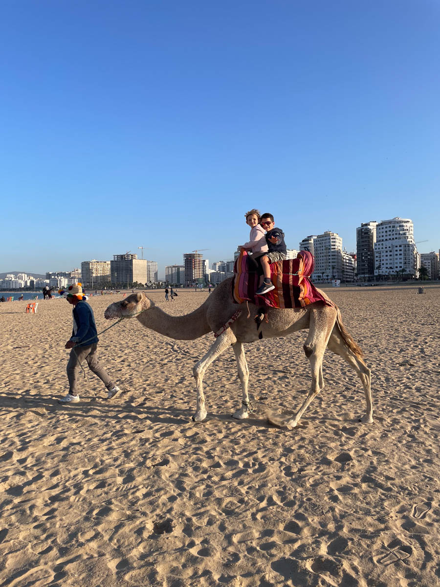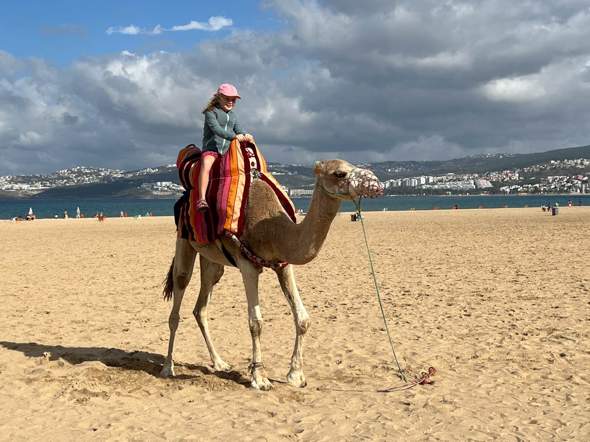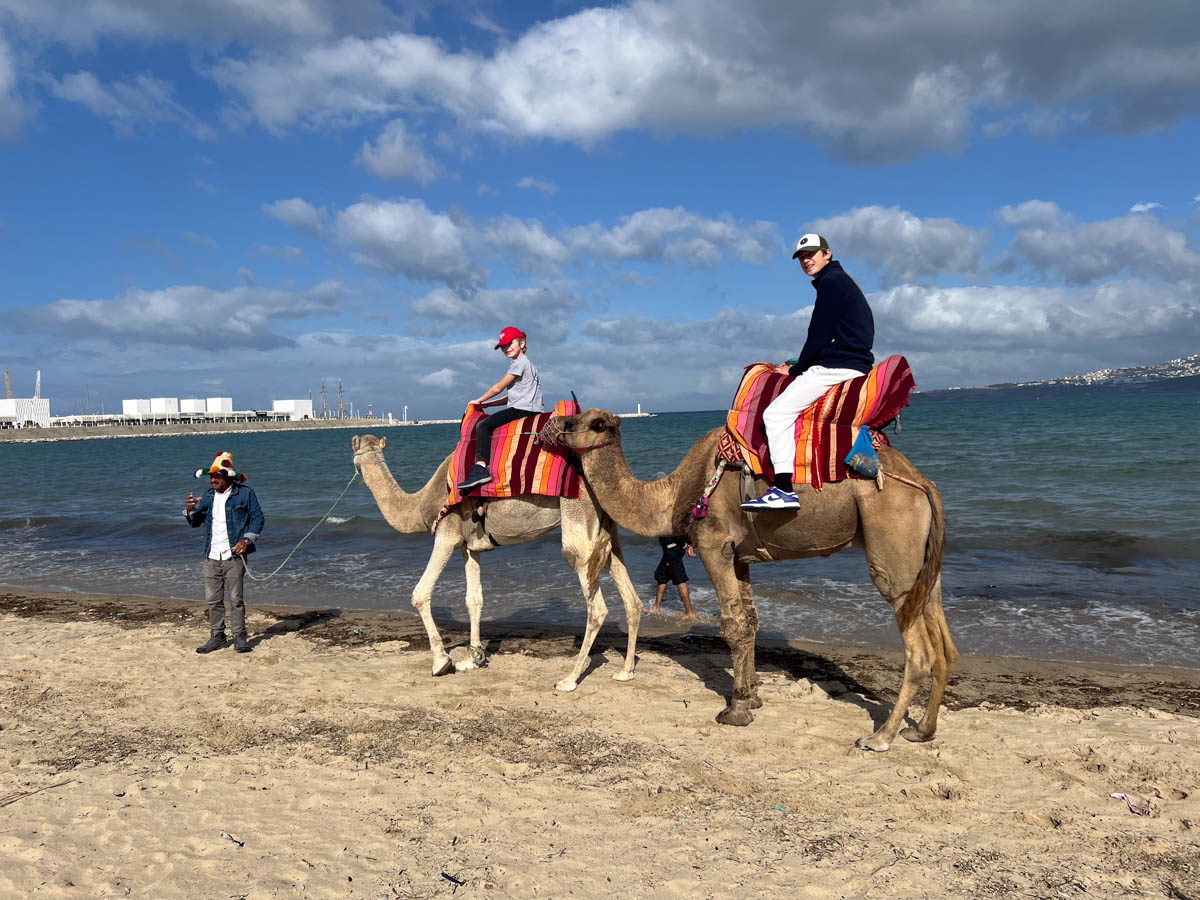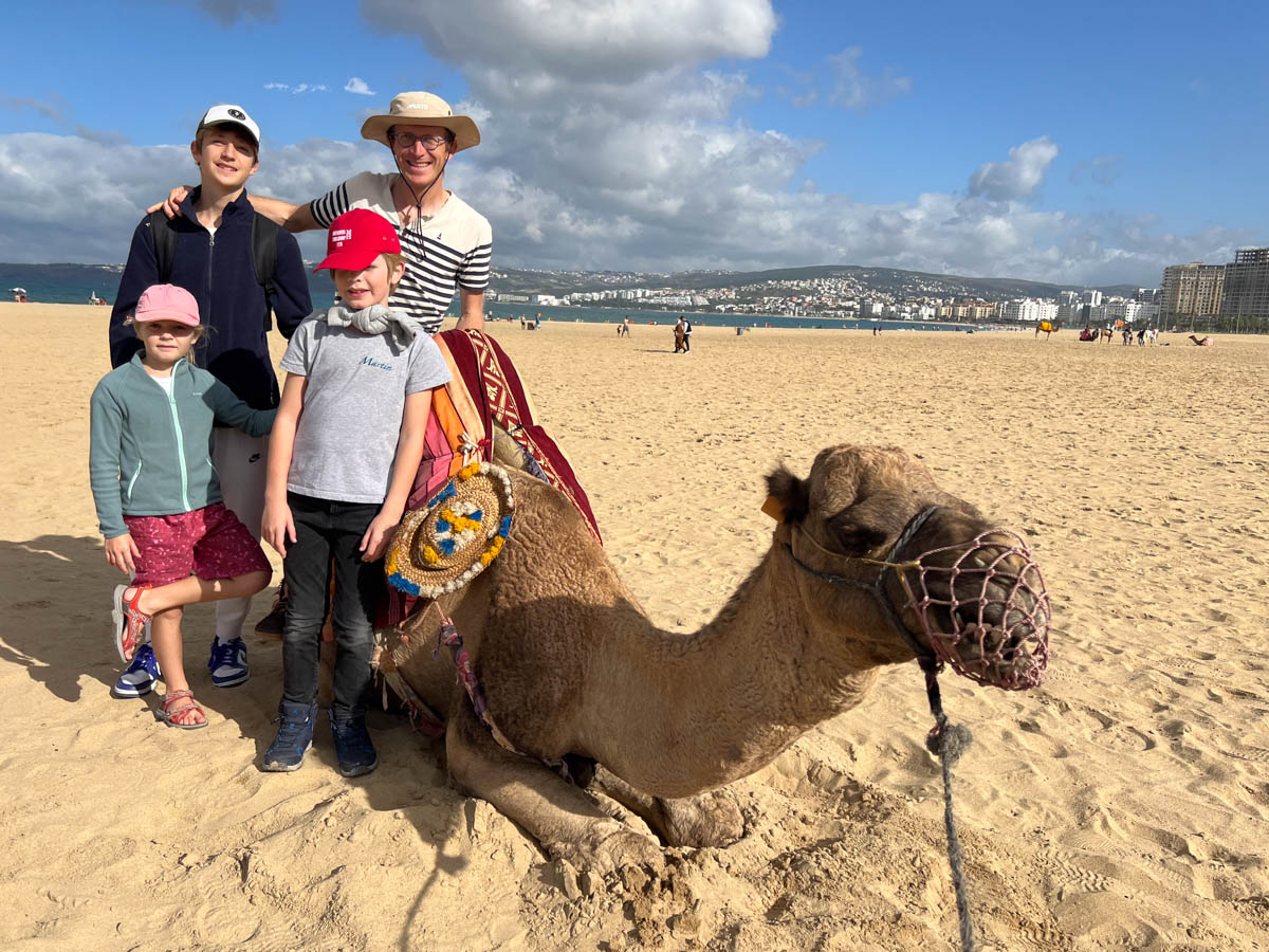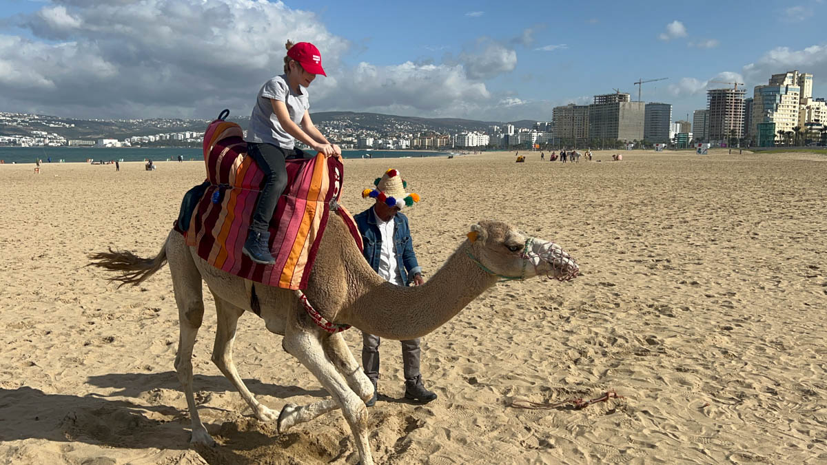 Antoine arrive à motiver tous les enfants restants à bord pour marcher jusqu’à la plage et y faire une promenade en dromadaire. Il trouve un chamelier qui a une famille de dromadaires avec la maman de 14 ans, son fils de 6 ans et le petit dernier de 1 an. Arthur monte sur le fils qui est plus grand et Martin sur la maman. La première étape est de monter sur le dos du dromadaire couché, et ensuite de rester en selle quand il se relève sur ses pattes. Ils vont en caravane jusqu’à la mer et reviennent. Martin trouve que le pas du dromadaire bouge comme un bateau, il faut dire que le dromadaire amble contrairement au cheval qui marche. La descente s’effectue sans encombre, chacun est bien accroché pendant que leur monture se met à genoux. Mathilde est rassurée d’avoir vu ses frères en selle, alors elle va faire la balade avec Antoine. C’est unique de pouvoir faire du dromadaire sur la plage !