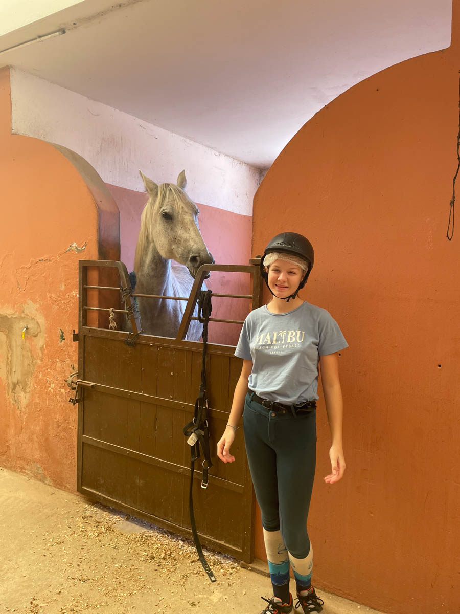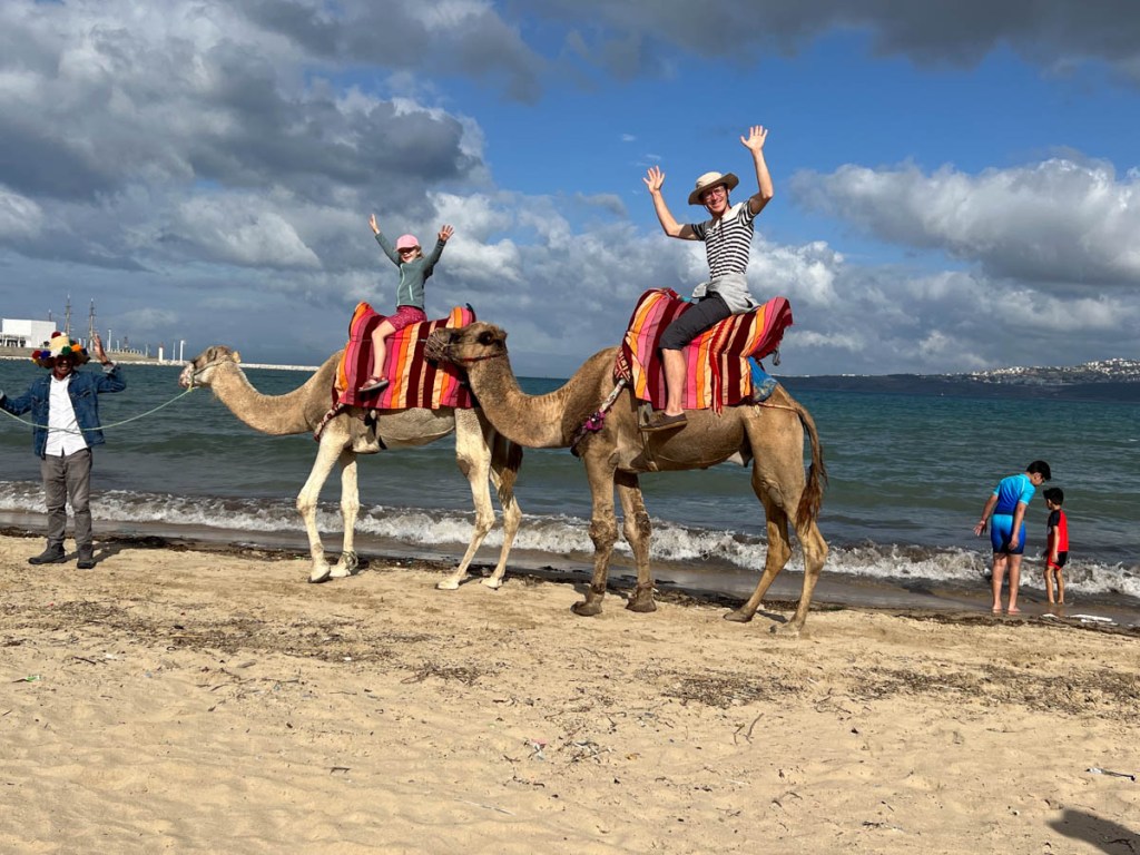 Samedi 2 novembre au matin, Alice est bien motivée pour se lever tôt pour l’école car, en cadeau d’anniversaire en avance, Magali l’emmène faire une balade à cheval ensemble sur la plage à 14h. Le premier défi est d’arriver au club en taxi. J’avais (Magali) commandé un taxi conduit par une femme recommandée par une locale mais elle a crevé une roue avant de nous prendre. Nous marchons avec Alice jusqu’à l’avenue pour en héler un. Nous en trouvons un rapidement mais il ne parle que très peu anglais ou français. Je lui montre sur le GPS le Royal Club Équestre de Tanger. Nous y arrivons en avance mais quand le bureau ouvre sa porte on nous explique que les balades à cheval ce n’est pas ici mais au Royal Centre Équestre du Détroit à 30 minutes de là. 😟 Nous voilà reparti à la recherche d’un autre taxi qui ne parle pas plus anglais ou français, là encore le GPS nous amène à bon port. Nous n’avons qu’une demi-heure de retard. 😅. On apprend qu’il y a 3 Royal Centres Équestres à Tanger, on n’est pas les premiers à se tromper. Ce club est magnifique et les chevaux plutôt beaux. Un palefrenier nous prépare nos montures et nous accompagne à pied jusqu’à une très grande plage de sable blond. On nous avait dit qu’on ne ferait que du pas mais le palefrenier nous dit (en signe car on ne se comprend pas en arabe) que nous pouvons galoper : alors nous voilà partis Alice et moi le long de la mer à galoper en liberté. On est tous les deux super contentes de cette belle escapade. Alice est rassuré de n’avoir pas perdu ses réflexes à cheval. Quand le palefrenier nous fait signe, nous rentrons. Une fois les chevaux dessellés, il faut trouver un moyen pour rentrer. Je fais des messages à la chauffeuse de taxi mais sans réponse. Nous en profitons pour regarder les cours de saut d’obstacles, on se croirait en France avec le moniteur qui ne parle que français à ses élèves et les parents autour qui discutent en français… ça doit être vraiment réservé aux riches marocains. La chauffeuse de taxi ne répondant toujours pas, nous allons voir le gardien qui nous trouve un inDrive (équivalent du Uber marocain) pour rentrer pour moins cher qu’un taxi. Nous partageons la voiture avec un français qui est déposé sur le chemin. On discute de la culture marocaine vu par un français qui revient au pays pour les vacances scolaires.