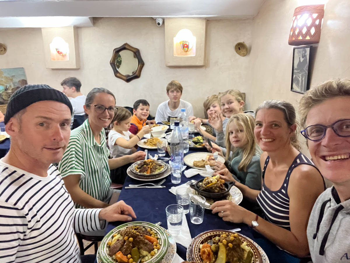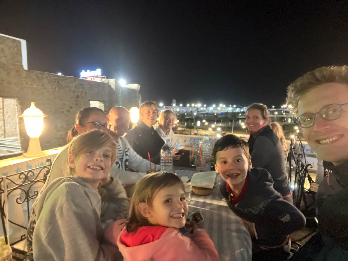 Nous nous retrouvons tous ensemble au ponton quand Ilo doit s’amarrer à côté de nous, Antoine le guide dans la manœuvre qui consiste à faire un créneau entre 2 catamarans. Heureusement que nos catamarans sont équipés de 2 moteurs qui permettent d’être très maniables. Une fois que tout est rangé, nous les emmenons dîner dans le restaurant de tajine de jeudi dernier. Nous avions nous-mêmes trouvé si agréable d’être guidé par les copains vers un bon endroit sans avoir à chercher nous même que nous faisons pareil avec Ilo. Nous sommes bien contents de les retrouver et ils nous racontent leur traversée express du détroit de Gibraltar en 5h soit 30% de moins que nous ! Et entièrement à la voile et avec le courant, ils ont maîtrisé le vent et les courants beaucoup mieux que nous !