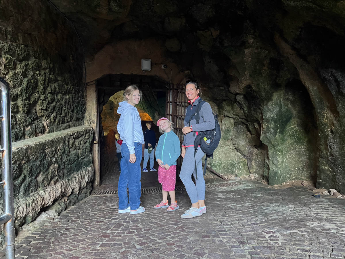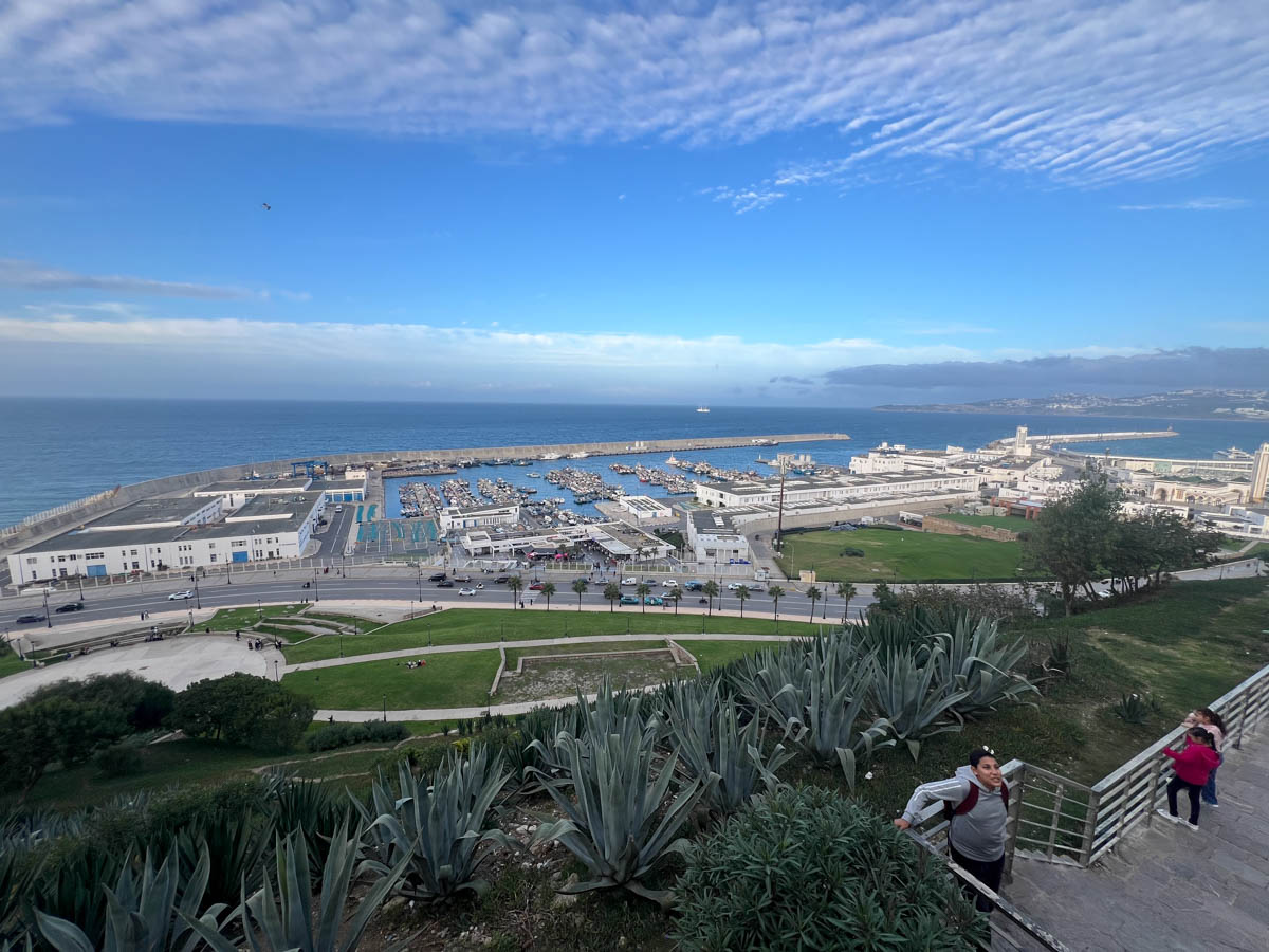 Mercredi 6 novembre, nous poursuivons notre exploration des environs de Tanger grâce au bus City Tour. Nous longeons la mer, traversons les quartiers chics avec des villas luxueuses, passons devant les parcs botaniques puis les forêts méditerranéennes, continuons vers l’ouest jusqu’au cap Spartel qui marque la mythique frontière entre l’océan Atlantique et la mer Méditerranée et enfin nous nous arrêtons à la grotte d’Hercule. Les sites internets mettant ce lieu dans le top des choses à voir, nous nous attendons à une belle grotte. Nous payons l’entrée à 8€ par personne et pénétrons dans l’antre du héros de la mythologie… La déception est très grande, en fait la partie visitable de la grotte est minuscule avec une seule salle qui a été exploitée comme carrière de pierre depuis les romains. Donc toutes les parois ont été raclées et il n’y a plus une seule stalagmites ou tites visibles. Nous prenons la photo « Instagrammable » de l’ouverture vers la mer en forme de carte de l’Afrique et nous ressortons dépités de cet attrape-touristes, les enfants la renomme la « grotteflop ». Nous avons le temps avant de reprendre le bus de marcher sur les rochers le long de la mer et prendre un goûter à base de glace et thé à la menthe. Le bus du retour nous reconduit à Tanger et nous revoyons les paysages dans l’autre sens. On se rend mieux compte de l’étendue de la ville très vallonée.