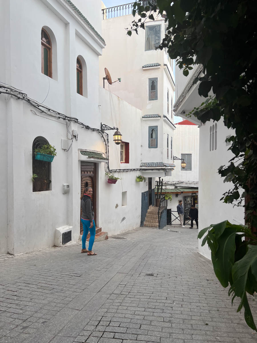 La fenêtre météo du mardi 5 novembre semble un peu faiblarde et nous hésitons à nous lancer sur la houle de l’Atlantique avec la perspective d’être secoués dans la pétole et de finir au près. Nous décidons donc d’attendre la fenêtre suivant prévue vendredi ou samedi. Nous prolongeons donc notre exploration de Tanger. Ce mardi, nous faisons le tour des remparts extérieurs et grimpons directement en haut de la kasbah avec les enfants. Nous tournons dans les rues blanches vertes et bleues à la recherche de l’équipage d’Ilo parti un peu avant nous. Après bien des détours, nous nous retrouvons près des tombes phéniciennes que nous ne les verrons pas car le soir tombe déjà. Il est alors l’heure de dîner et nous avisons un restaurant italien-marocain mais qui possède une magnifique terrasse, chacun trouve un plat qui lui plaît (c’est l’avantage des pâtes) tout en admirant la vue sur Tanger by night.
