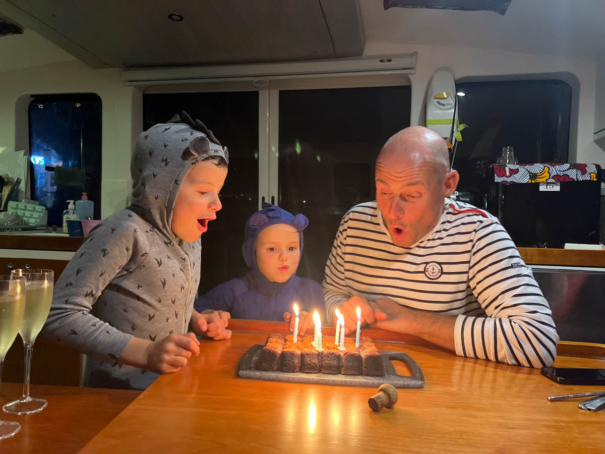 Le soir nous sommes invités à dîner chez Apsara. Babette a cuisiné un délicieux repas indien et nous avons apporté un tiramisu. C’est très sympa de se retrouver sur un autre Outremer 45, on partage sur tous nos petits trucs pendant que les enfants jouent ensemble.