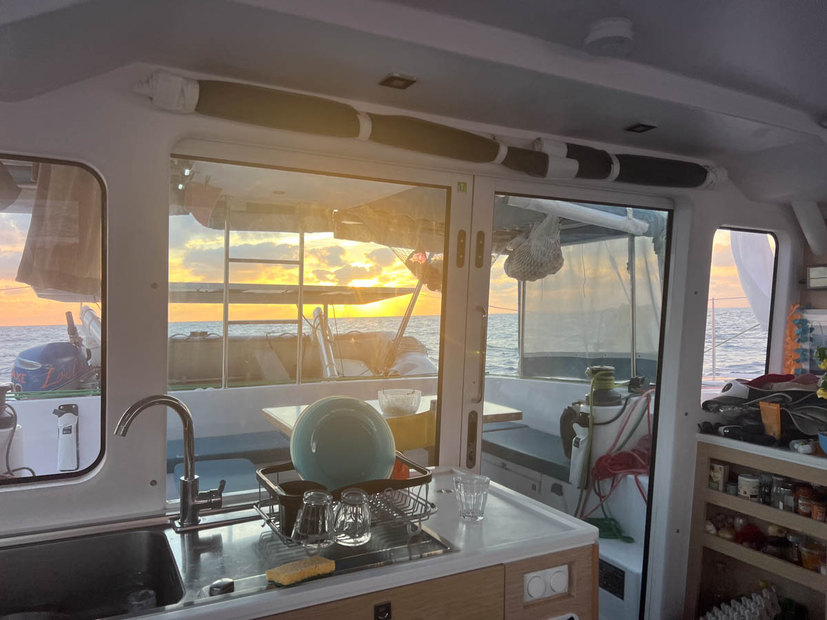 Encore pendant mon quart, vers 4h du matin, je constate que le hublot de la salle de bain de la coque des enfants fuit. Je n’arrive pas à savoir si c’est la moustiquaire extérieure qui gêne l’étanchéité du joint ou le scellement du hublot lui-même qui fuit (je constaterai plus tard que c’est bien le scellement qui fuit). Environ un verre par heure d’eau salée rentre dans la coque bâbord. Si nous n’épongeons pas régulièrement, l’eau fait son chemin dans la coque et vient mouiller les provisions qui sont stockées à fond de cale. Nous devrons donc nous astreindre à essuyer l’eau à chaque fois que nous irons aux toilettes de ce côté là.