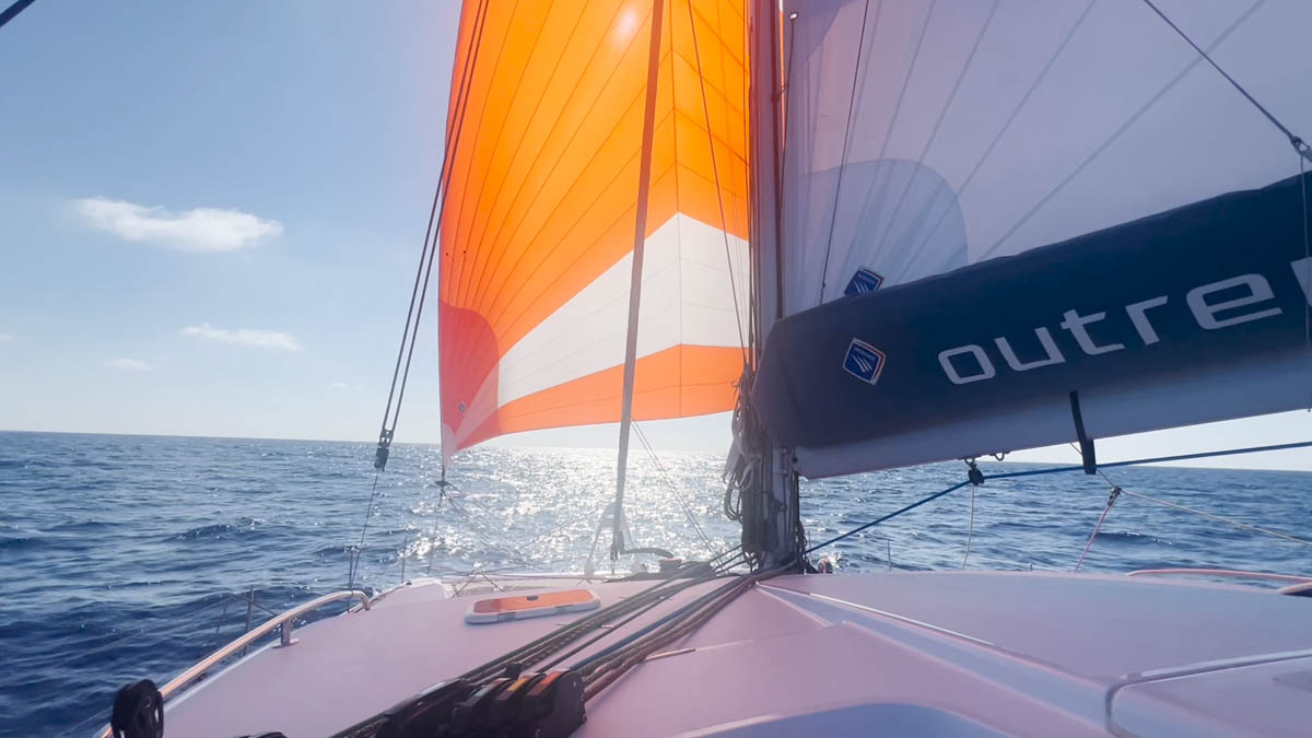 Nous empannons en milieu de matinée à nouveau vers le Sud et c’est beaucoup mieux pour les vagues. La houle vient maintenant de 3/4 arrière sur tribord et les vagues de 3/4 arrière sur bâbord. J’essaye même de gréer le gennaker sur l’étrave au vent au lieu du bout-dehors et cela nous permet de nous mettre encore plus vent arrière (160-165TWA pour les amateurs), un peu comme un spi symétrique. Le vent adonne encore et tout ça nous permet de mettre un peu d’Ouest dans notre route et d’aller davantage vers les Canaries. Magali cuisine à nouveau pour le déjeuner. Nous aurons fait 184MN les premières 24h, ce qui est une bonne moyenne puisqu’on a débuté avec peu de vent au départ.