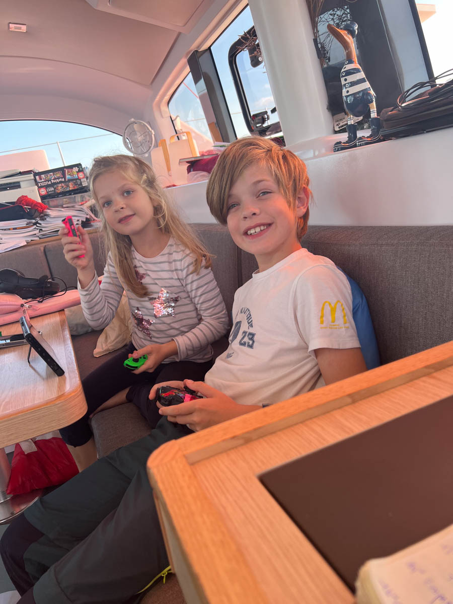 Dès que nous sommes de retour au ponton, il est temps de s’activer pour ranger l’annexe et préparer le bateau pour le départ. Nous traversons pour nous mettre au ponton de départ et lancer les formalités pendant que Magali et les enfants lavent le pont.