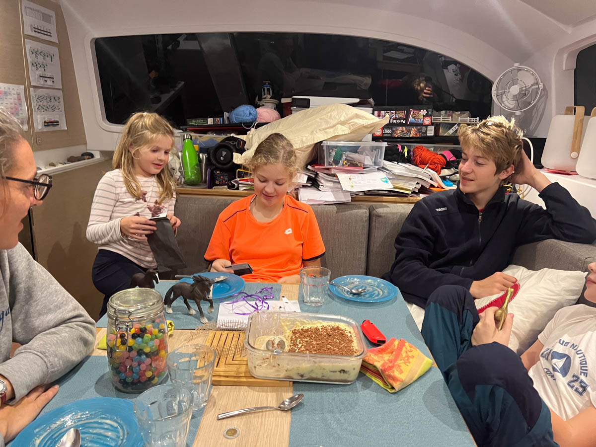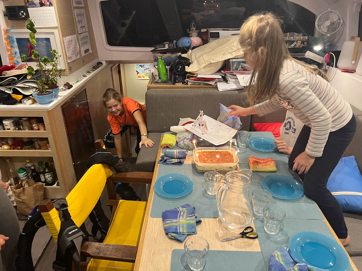 Ce soir du 10 novembre, c’est aussi l’anniversaire d’Alice. Malheureusement, depuis que les vagues se sont levées, elle a le mal de mer et a somnolé dans sa cabine depuis la nuit dernière. Nous réussissons quand même à la faire sortir de sa cabine pour manger un peu de riz-maïs-lardons et ouvrir ses cadeaux.