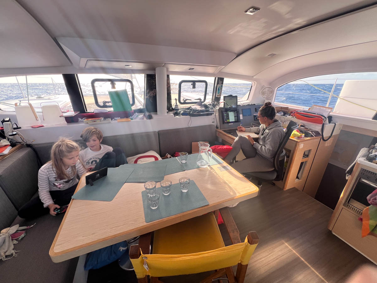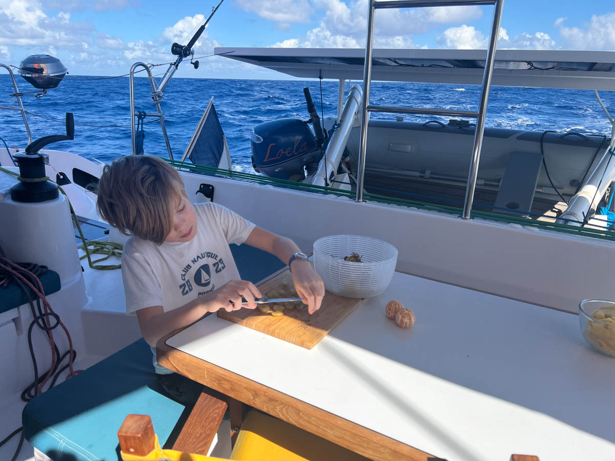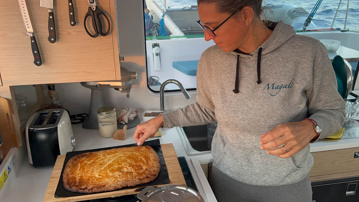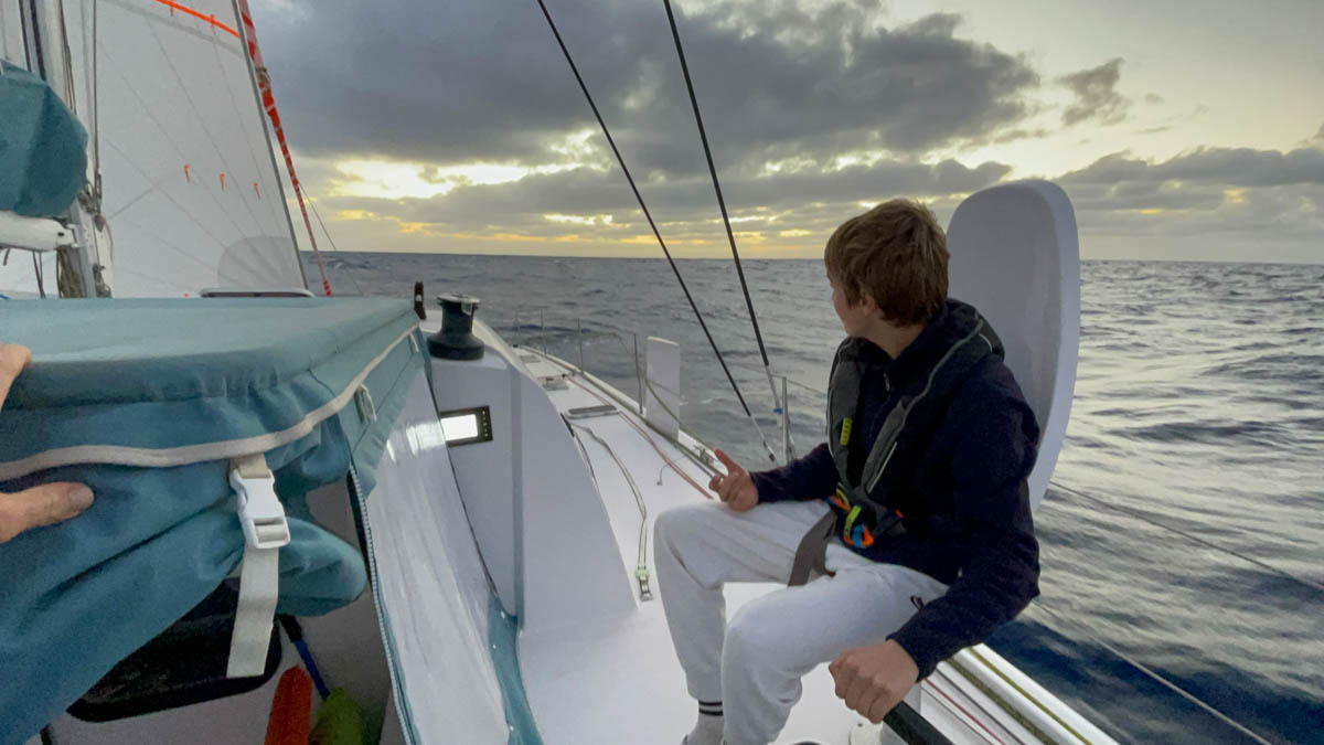48h après le départ, nous avons encore fait 179MN le deuxième jour, toujours avec un vent entre 18 et 20nds en moyenne et nos voiles réduites. Magali cuisine à nouveau des douceurs : un broyé du Poitou, du pain et des cookies. En début de soirée, Arthur se met à la barre pour s’entraîner dans ce vent plutôt soutenu. Il s’amuse à serrer un peu le vent et surfe jusqu’à 16nds. Nous rechargeons à nouveau nos batteries en faisant tourner les deux moteurs pendant 2h pour remonter nos batteries de 37% à 80%.