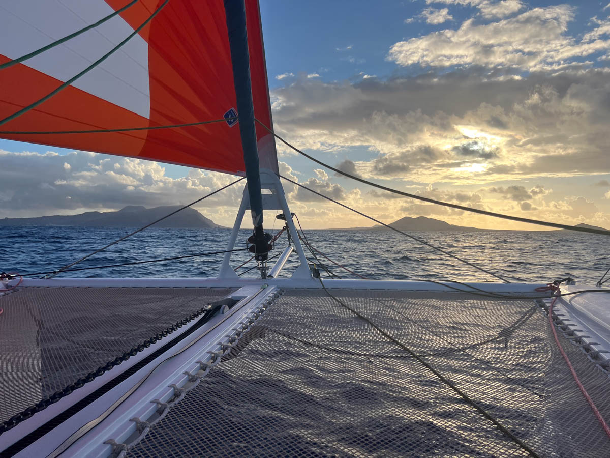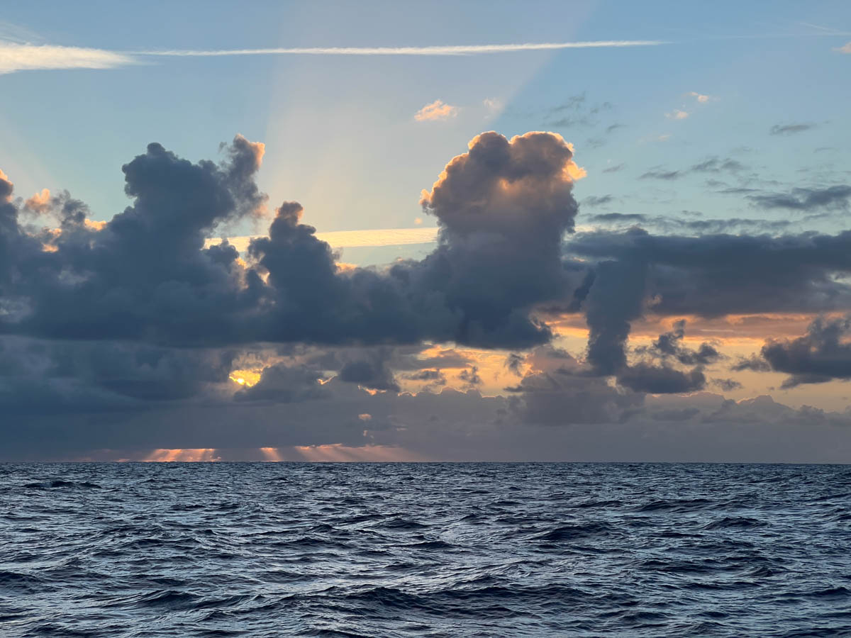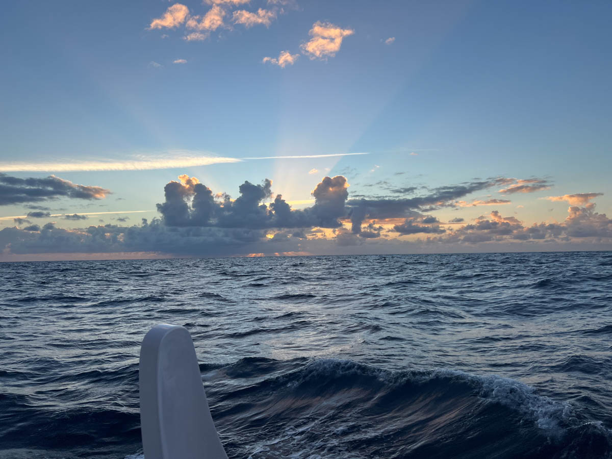 Comme d’habitude, Mathilde se lève la première un peu après un joli lever de soleil. La houle et les vagues commencent à se lever et ce n’est pas très confortable. Toutes les deux viennent de tribord, la houle légèrement de l’avant et les vagues légèrement de l’arrière, la faute aux vents d’Ouest et Nord-Ouest qui soufflent plus à l’Ouest et nous envoient le reliquat de leurs vagues.