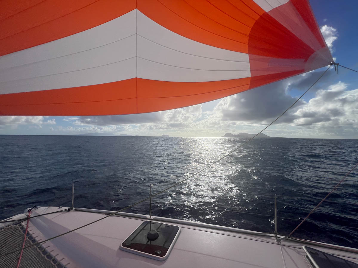 Nous pouvons enfin couper le moteur une heure plus tard et continuons sous grand-voile et solent malgré l’allure assez proche du vent car je pense que nous pourrons passer sous gennaker d’ici une heure ou deux car le vent doit s’orienter plus Nord au fur et à mesure que nous descendrons vers le Sud et nous écarterons de la côte. Nous hissons donc le Gennaker et une heure plus tard, nous pouvons le dérouler tout en restant presque sur la route.