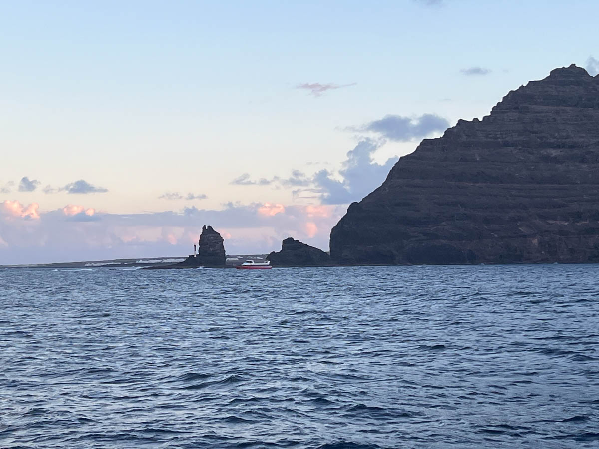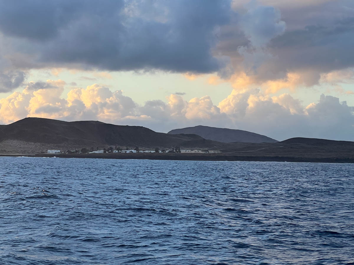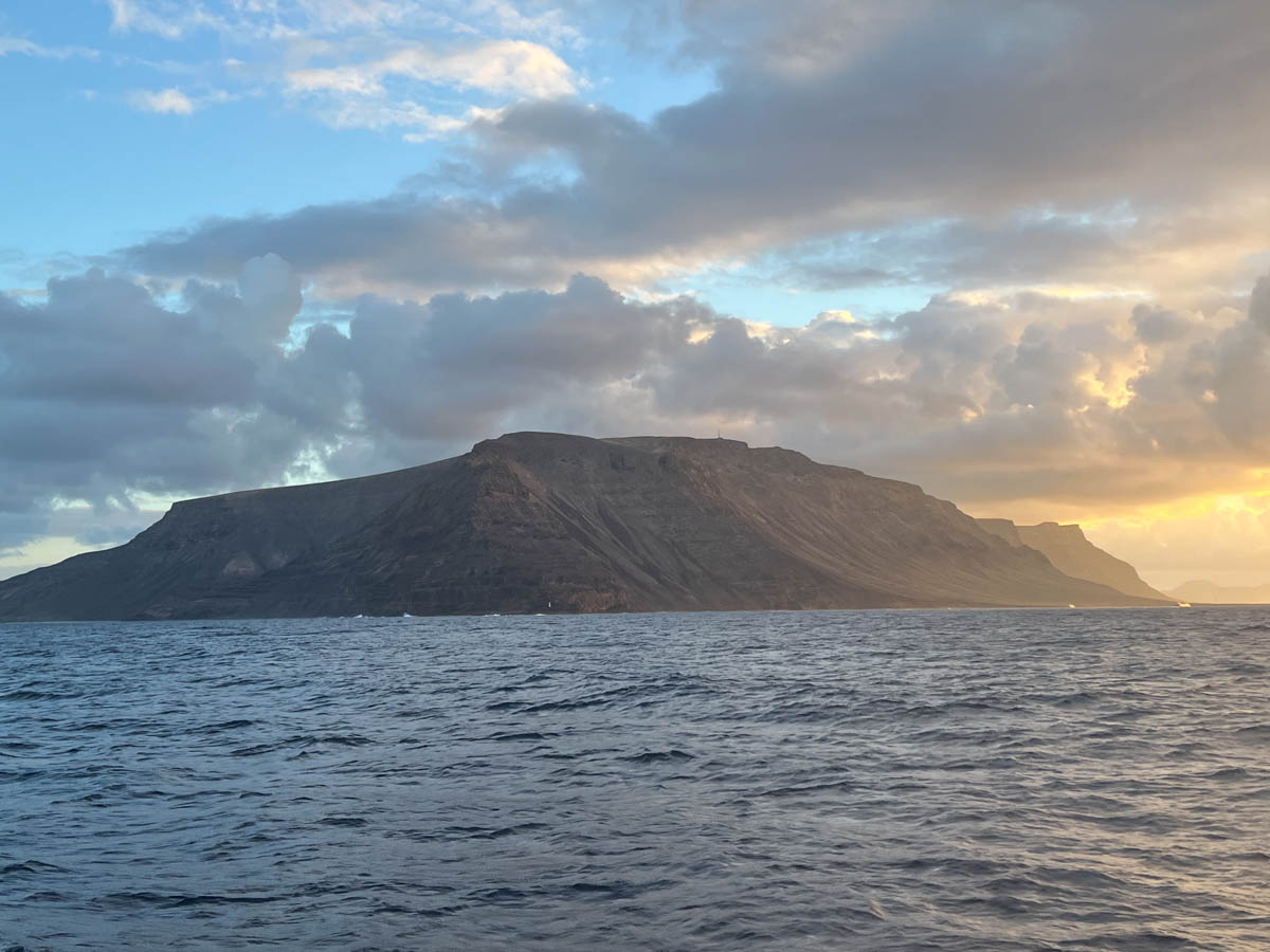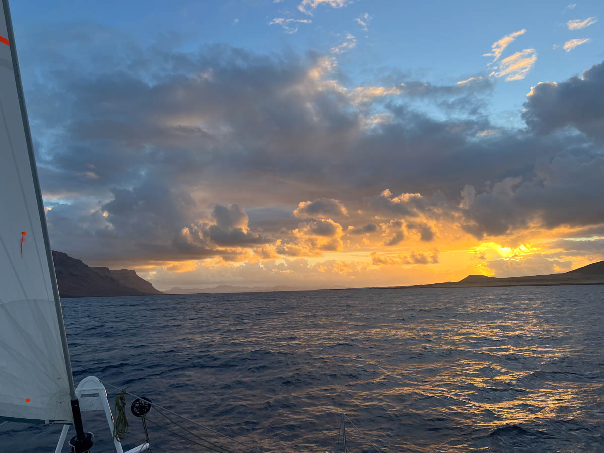 C’est l’Est qui l’emporte, pour le plaisir d’admirer le passage entre les deux îles désolées et les falaises impressionnantes de Lanzarote. Nous affalons le gennaker avant d’embouquer le passage entre les deux îles, dans les dernières lueurs du jour et rangeons le pont proprement pour l’arrivée.