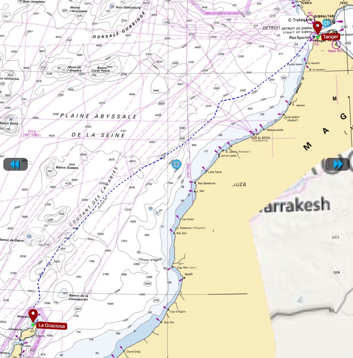 Du bon côté des choses, j’ai choisi une route au large du Maroc ce qui fait que nous ne croisons plus de bateaux depuis cette nuit. Cela nous permet de faire des siestes de 20 minutes entre deux tours d’horizon et de surveillance pendant nos quarts de nuit et c’est moins fatiguant (et j’en ai bien besoin avec les anti-douleurs qui me fatiguent bien).