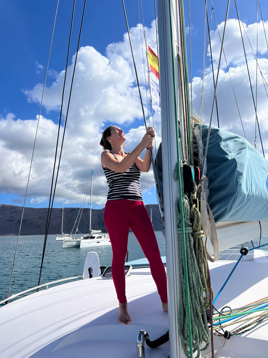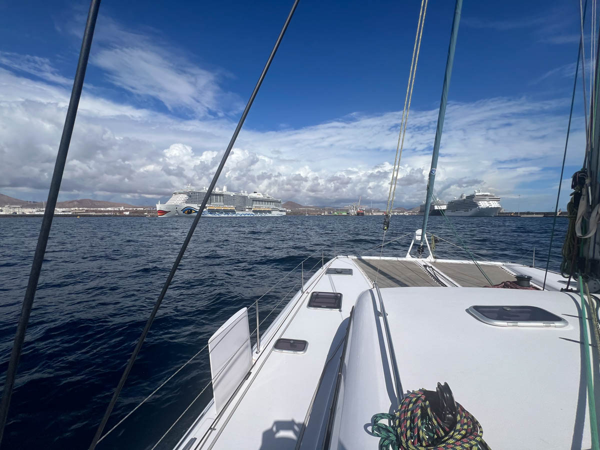 Samedi 16 novembre, dès que le soleil se lève vers 8h, nous remontons l’ancre et mettons les voiles vers Fuerteventura. Un Outremer 51 Nausicaa y est déjà au mouillage depuis quelques jours devant le port de Corralejo. Nous l’avons contacté et il nous assure qu’il n’y a pas trop de vagues et qu’on peut débarquer en annexe au port gratuitement. Ça nous semble un bon coin pour les prochains jours de vent d’ouest et sud-ouest et l’occasion de rencontrer un nouvel équipage avec un petit fille de 7 ans.