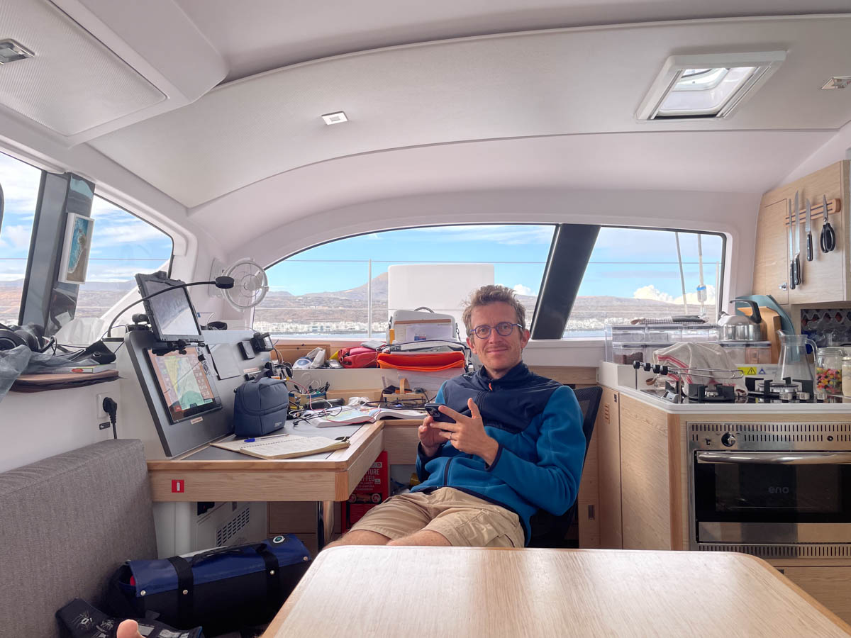 Nous avons navigué 3,5 jours entre Tanger et La Graciosa avec un vent régulier de nord-est. Nos séjours prolongés dans des ports aux eaux trop calmes nous ont désamarriné, alors on était tous un peu vaseux. Avec le prochain départ de l’ARC (rallye organisé entre les Canaries et les Antilles) toutes les marinas sont remplies, on va explorer les mouillages des îles de l’est. Mais la météo nous joue encore des tours : habituellement les Canaries sont balayés par des vents du nord et nord-est, mais une dépression très basse s’annonce qui envoie des vents d’ouest à sud-ouest, tout l’inverse des standards ! On va devoir s’adapter …