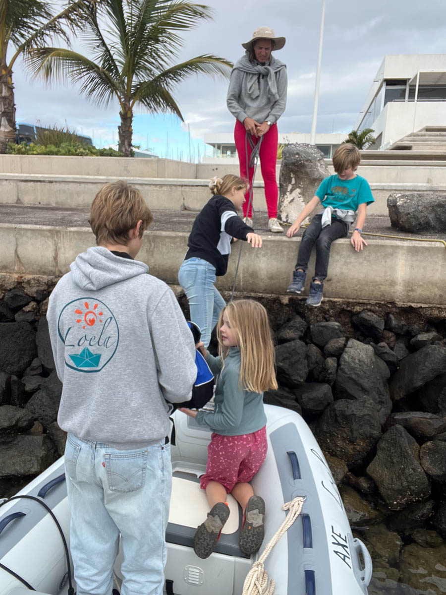 Nous avons décidé de revenir à Lanzarote pour aller visiter l’île de l’intérieur. Nous déroulons le gennaker et en une heure nous sommes de l’autre côté. On va tellement vite et le congélateur est tellement plein que nous ne mettons pas la ligne de pêche. On va mouiller à Playa Blanca devant la marina Rubicon. C’est un immense resort touristique mais on peut mouiller devant la digue et aller en annexe gratuitement. On motive les enfants et on réveille Arthur grâce a la promesse d’une grosse glace a terre.
