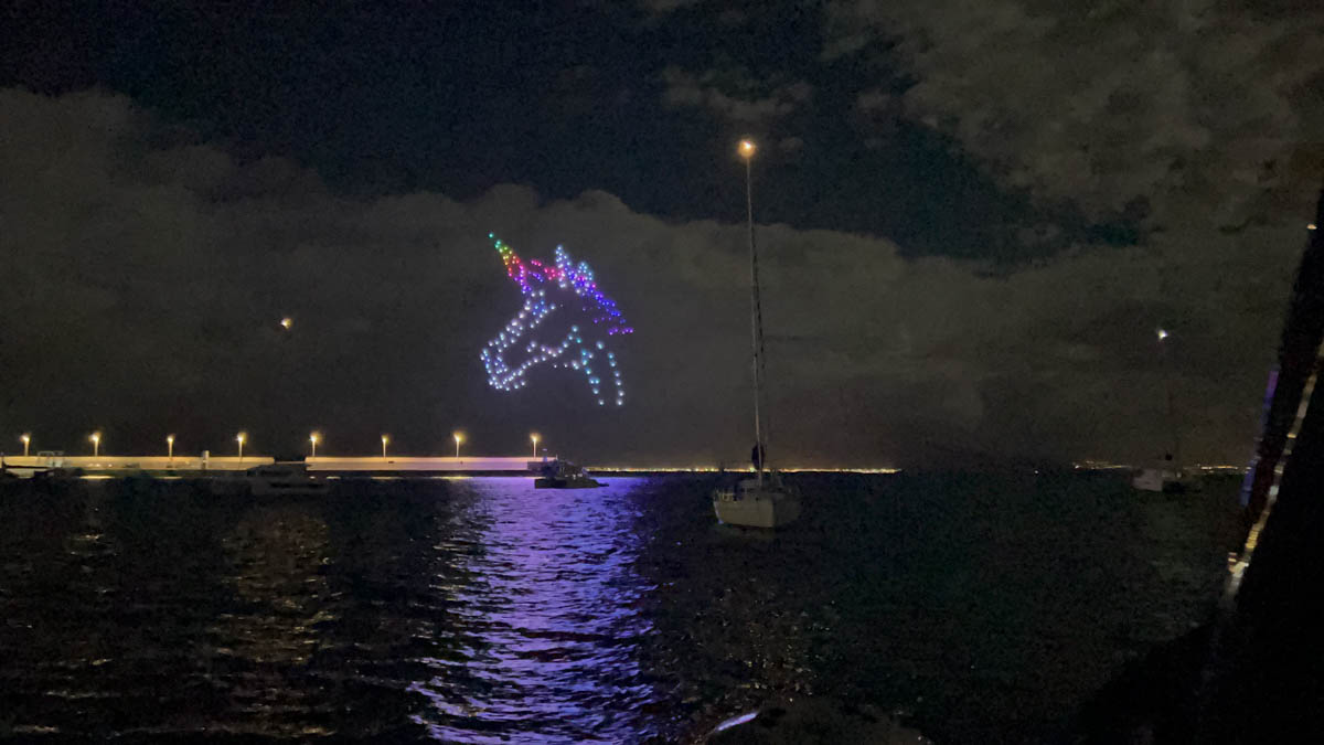 Nous dînons sur le bateau pour ne pas rater la soirée film du samedi soir. A 21h30 nous avons la surprise d’assister à un spectacle de drones sur la jetée : une centaine de drones se positionnent et s’éclairent de différentes couleurs pour former un dragon, une licorne, une sirène, une fée clochette, un château… c’est féerique.