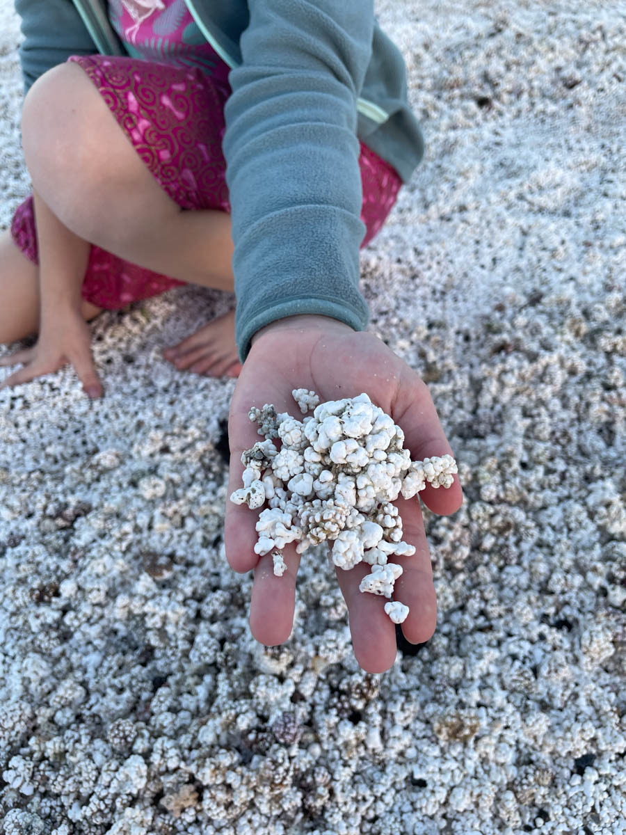 Au retour du sauvetage Antoine va rencontrer l’équipage de Nausicaa et nous partageons le délicieux gâteau de Zoé (7 ans) avec Kalo et Lia qui viennent nous voir sur Loela. Ils sont luxembourgeois et français et voyage en bateau en Asie depuis 10 ans. Actuellement ils s’occupent du catamaran d’un ami qui voudrait rejoindre les Philippines avec son Outremer 51. Ils nous montrent où on peut amarrer notre annexe au port et ils nous font découvrir une plage de popcorn : ce sont des morceaux de corail blanc qui se sont déposés sur la plage. On dirait des popcorns ou bien du chou-fleur.