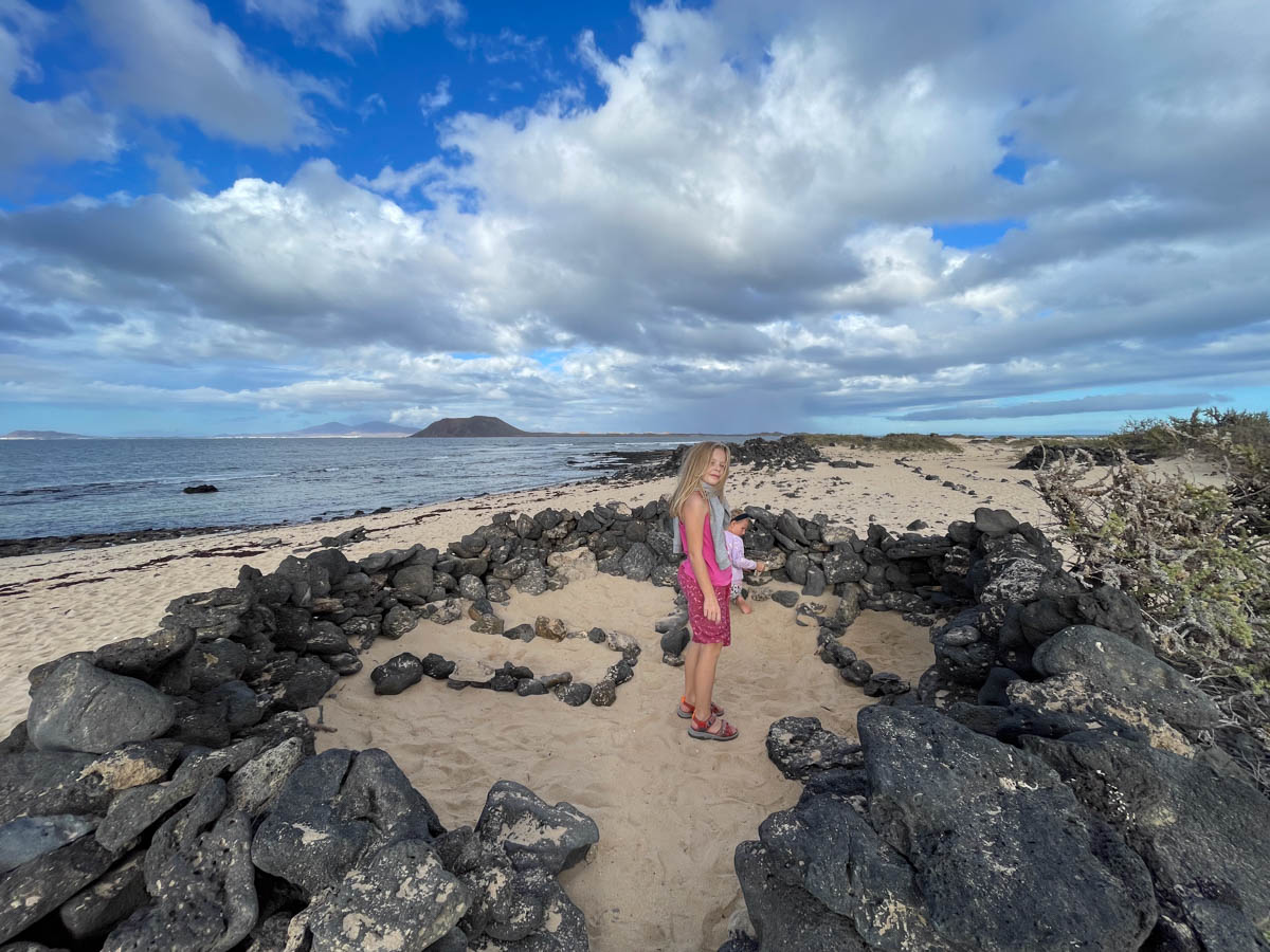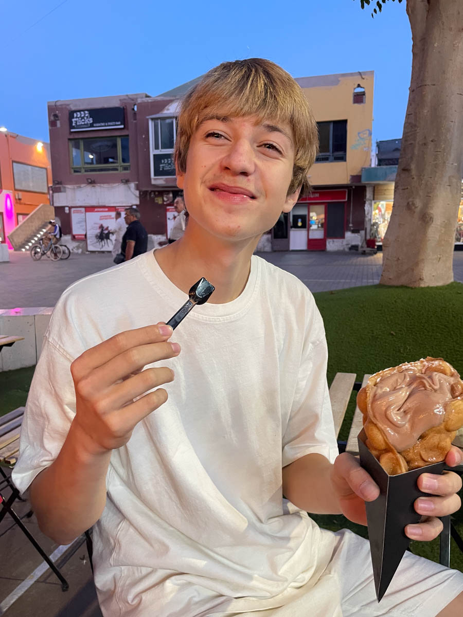 Dimanche 17 novembre on va déjeuner à un bar de plage avec les 4 bateaux copains. Les pieds dans le sable on ne se croirait pas en novembre (il paraît qu’il fait froid en France). Après le repas nous marchons jusqu’aux dunes de sable avec l’équipage de Nausicaa qui s’étendent au sud de la ville. Les enfants ralent sur le chemin mais une fois arrivée sur place on découvre des murets de pierres noires disposées en cercle pour se protéger du vent. Ça fait de super cabanes. On a du mal à les faire rentrer mais la promesse d’une glace les motive. Grâce à l’équipage de Matthew on déguste les meilleures glaces artisanales et des bubble waffles divines.