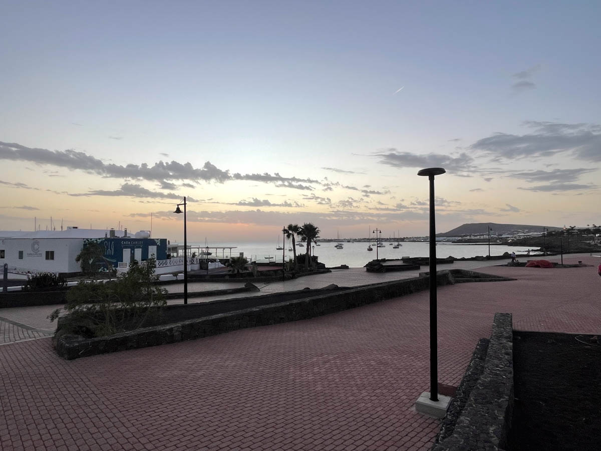 Vendredi 15 novembre, nous levons l’ancre dès 8h30 pour descendre vers Arrecife. Les marina sont pleines alors nous visons un mouillage entre le port de commerce et la marina, c’est peut être interdit mais nous tentons quand même, à défaut d’autre abri du vent prévu. Nous arrivons à l’heure du déjeuner et nous voudrions bien aller à terre pour un petit restaurant. Nous avons bien du mal à trouver un endroit pour notre annexe : tout est barricadé et la marina veut même appeler la police. Nous trouvons un quai après un pont bas et nous nous accrochons à des pierres (peut-être des sculptures). Nous allons au premier restaurant appétissant et nous réconfortons avec de bons hamburgers. Nous ne sommes pas très rassurés pour notre annexe et notre bateau alors, dès le dessert terminé, nous retrouvons nos embarcations et nous finissons l’après-midi tranquille à bord. À la tombée de la nuit un policier prévient Apsara que notre mouillage n’est pas autorisé. Nous n’avons pas envie de partir de nuit, alors nous décidons de braver l’interdit en restant cette nuit mais nous partirons demain matin dès le lever du jour vers un autre mouillage protégé du vent de sud-ouest. Nous nous réconfortons en fêtant la fête de Saint Arthur avec un tiramisu crémeux. 😋