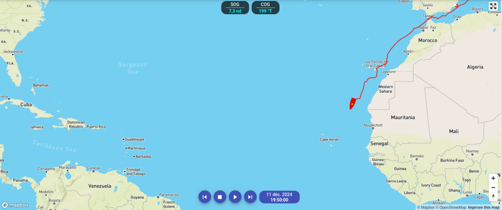 Dans les premières heures du mercredi 11 décembre, le vent accélère une première fois vers 14nds pendant le quart d’Arthur, ce qui nous fait passer de 6 à 7nds, puis à 15nds dans le quart de Magali et nous passons à 8nds. Nous filons droit vers un Tanker à l’arrêt en pleine mer au large de la Mauritanie « en attente de commande » (ou d’ordres ?)… apparemment depuis une semaine d’après les infos de son AIS. C’est justement le moment d’empanner, nous le laissons donc loin à bâbord.