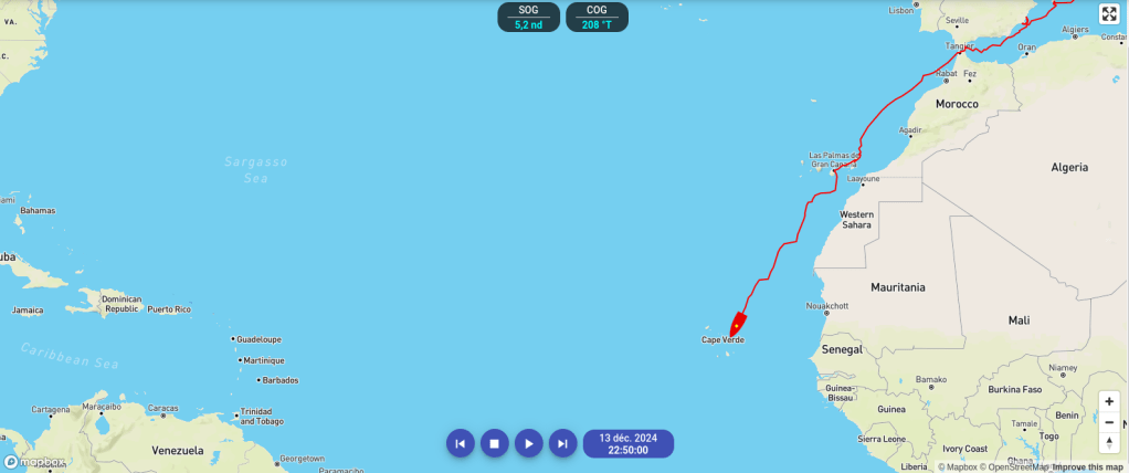 La météo à court terme est relativement simple, tout droit vers l’archipel du Cap Vert, de préférence là où le passage est le plus large, entre Sal et San Nicolau. Pour l’instant on va tirer le bord bâbord et on verra dans la journée si et quand on se recale. C’est la météo à moyen (5J) et long terme (transat complète) qui occupe Antoine, comment négocier le virage au Cap Vert, sortir « haut » (en latitude vers le Nord) avec l’objectif de passer au Nord des Sargasses ou plutôt décalé vers le Sud pour passer en dessous du paquet du haut. Le Nord de ce paquet risquant de devenir une zone de calme au moment de notre passage à cause d’une énième dépression Atlantique venant se glisser très Sud. Antoine fait des hypothèses mais comme la météo est peut fiable à plus de 4j, ça reste des hypothèses à vérifier plus tard. Demain, ce sera le virage du Cap Vert et combien de vent on aura qui va être l’objet de notre attention.