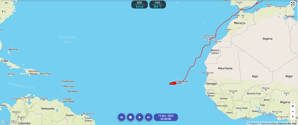 Vers 17h, nous avons parcouru 165MN aujourd’hui, peut-être un peu plus (on est un peu perturbé avec le changement d’heure sur le suivi journalier). Cela nous amène à 1100MN depuis le départ et il nous reste un peu plus de 2000MN à parcourir vers les Grenadines. Cette journée était vraiment une belle journée de vie à bord sur une mer belle avec un vent coopératif et un bateau bien stable.