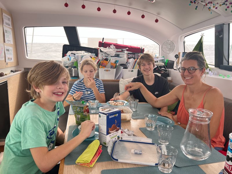 L’après-midi, chacun joue ou fait la sieste. Antoine s’occupe de préparer l’arrêt technique que nous prévoyons en Martinique en janvier pour traiter les points SAV que nous avons découverts pendant ou avant la traversée. Nous avons quelques petites fuites qu’il ferait bon voir réparées avant de poursuivre vers le Nord et la troisième partie de notre voyage. Un passe coque (sous la ligne de flottaison) suinte légèrement, un autre (au-dessus de la ligne de flottaison) a été réparé par l’intérieur par Antoine mais devra être reposé correctement. Deux hublots ont été plus ou moins bien réparés par Antoine à Las Palmas mais il faudra les réparer définitivement. Nous voudrions aussi faire repositionner les gaines de câbles qui sont tombées dans le mât. Rien de dramatique mais ce qui sera fait ne sera plus à faire et ne s’aggravera pas.
