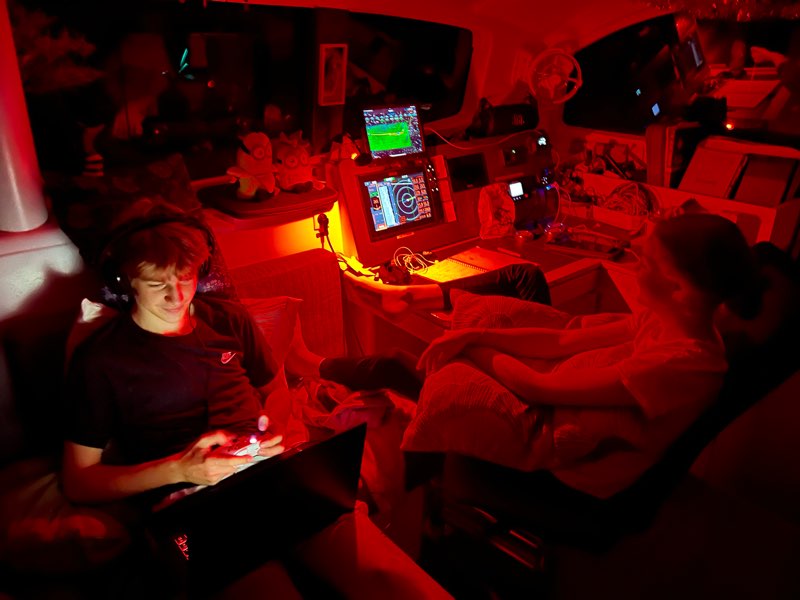 Ensuite, nous hissons et déployons le code zéro, qui tire moins fort, forcément mais qui permettra, nous espérons d’encaisser le vent plus fort que nous avons l’habitude d’avoir en début de nuit quand la chaleur de la journée s’évacue dans les nuages, perturbant le flux du vent établi. Nous aurons le plaisir que ce présage se réalise. La configuration passant brillamment le test des premières heures de la nuit, avec un Antoine un peu stressé quand même de voir le résultat mais une Magali bien reposée d’avoir pu dormir en continu avant son quart.