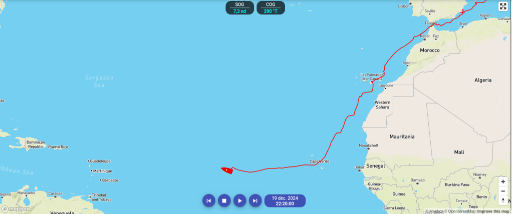Au point de 17h UTC, nous avons parcouru 179MN malgré les ralentissements liés aux sargasses. Et nous avons eu notre meilleure journée de charge batterie solaire puisque nous n’avons perdu que 18%! De charge batteries sur 24h. Cela ne nécessitera qu’une heure de moteur sur les deux moteurs car nous n’avons pas besoin de refaire de l’eau. Un temps plus calme est prévu sur les prochains jours et la mer se calme déjà. Nous espérons reprendre un rythme d’activités familiales dès demain. À suivre !