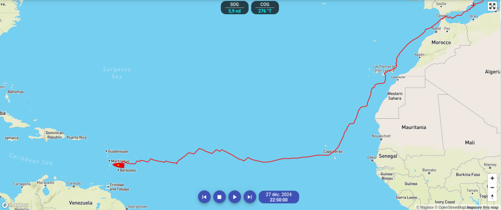 Après le déjeuner, c’est l’heure du point de 1700UTC. Nous avons fait une toute petite journée à 157MN mais nous venons de dépasser les 8000MN parcourus sur Loela depuis sa mise à l’eau ! Il nous reste un peu moins que ce que nous avons parcouru dans la journée mais en ligne directe alors que notre destination est pile dans l’axe du vent. Nous espérons arriver à Bequia demain avant la nuit…
