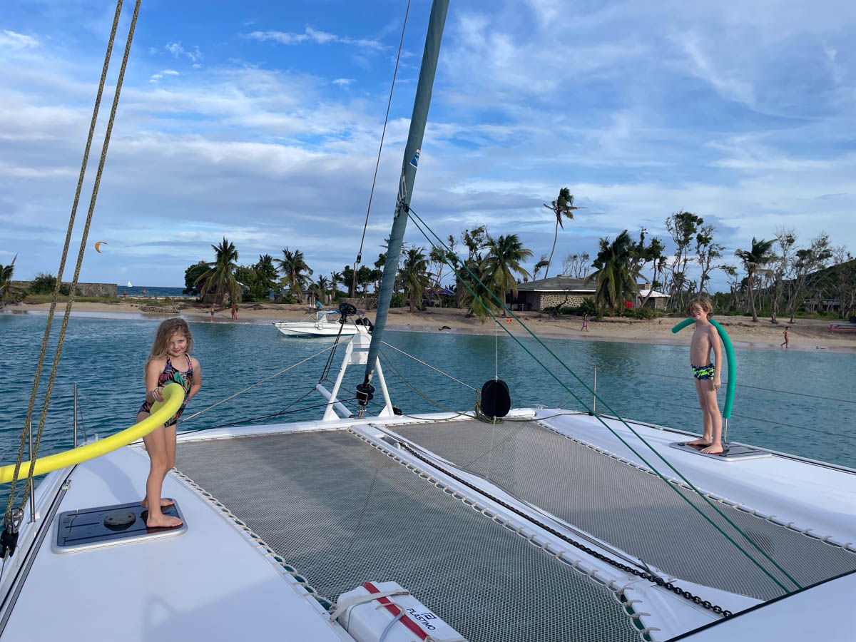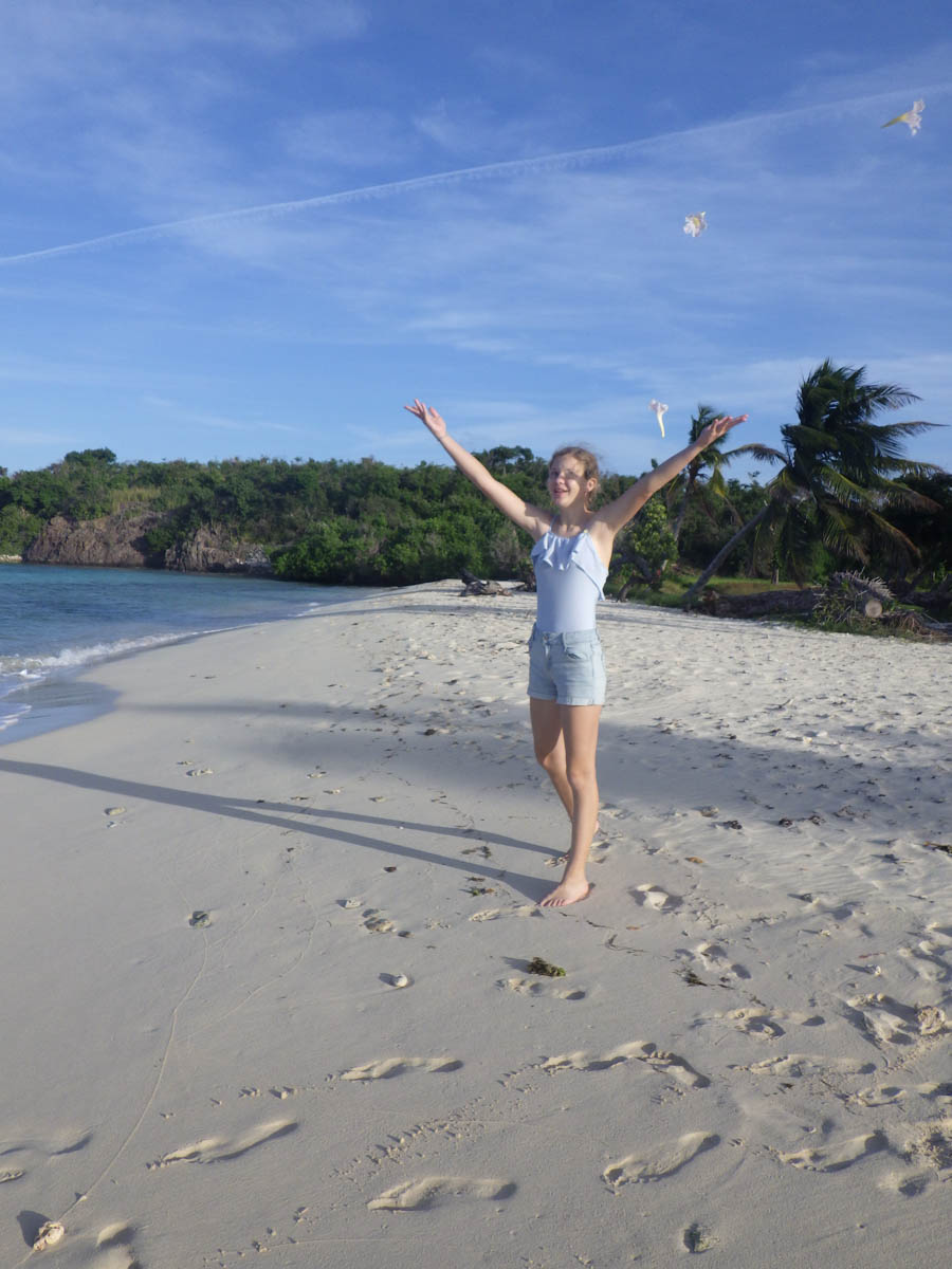 Nous arrivons dans la baie de … vers 16h. Nous sommes accueillis par Freddy qui nous propose de prendre la dernière bouée mais nous hésitons à la laisser à Malea et à jeter l’ancre tout devant la plage dans 2 mètres de fond. Le temps de se décider un monocoque arrive et prend la dernière bouée. On va rester à l’ancre. Au moins nous pouvons aller à la plage à la nage. Il y a des cocotiers sur la plage et nous y allons tout de suite en paddle, faisons des photos de carte postale, des tortues en sable (super sable à château) et du cerf-volant.