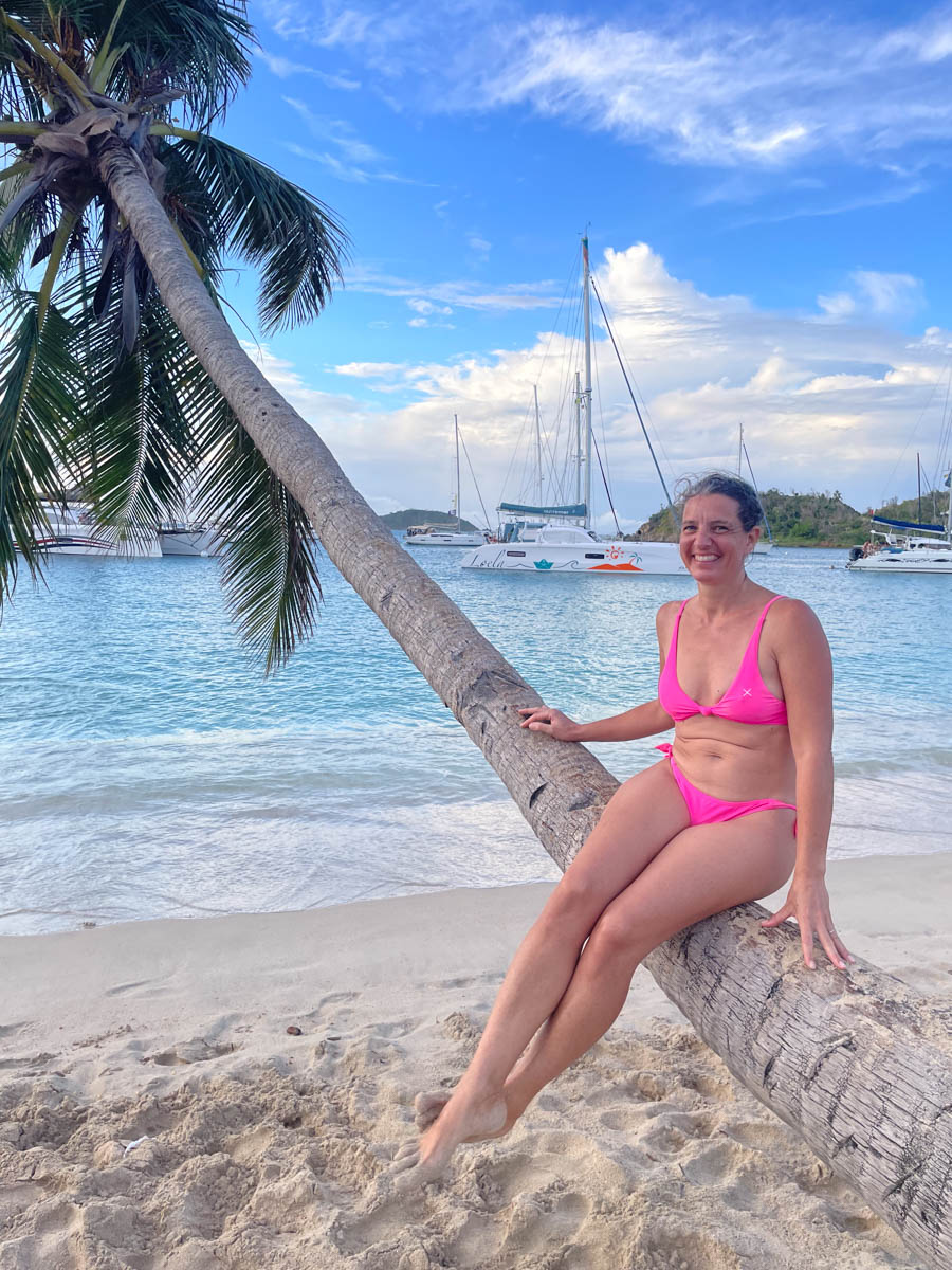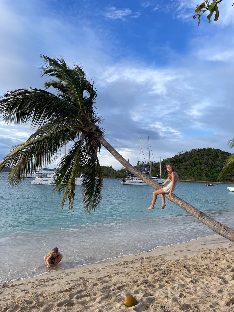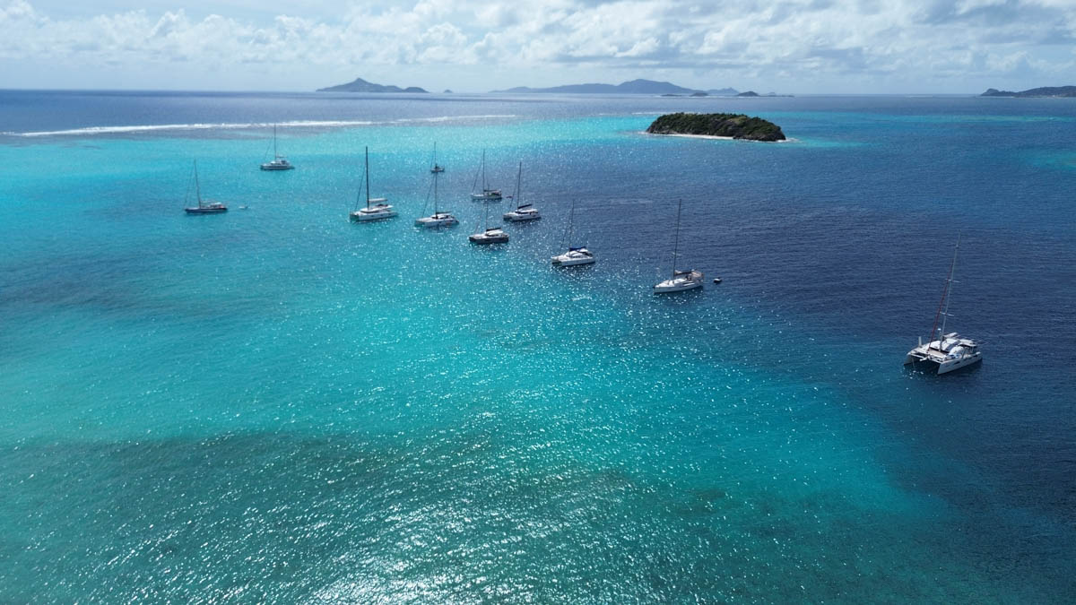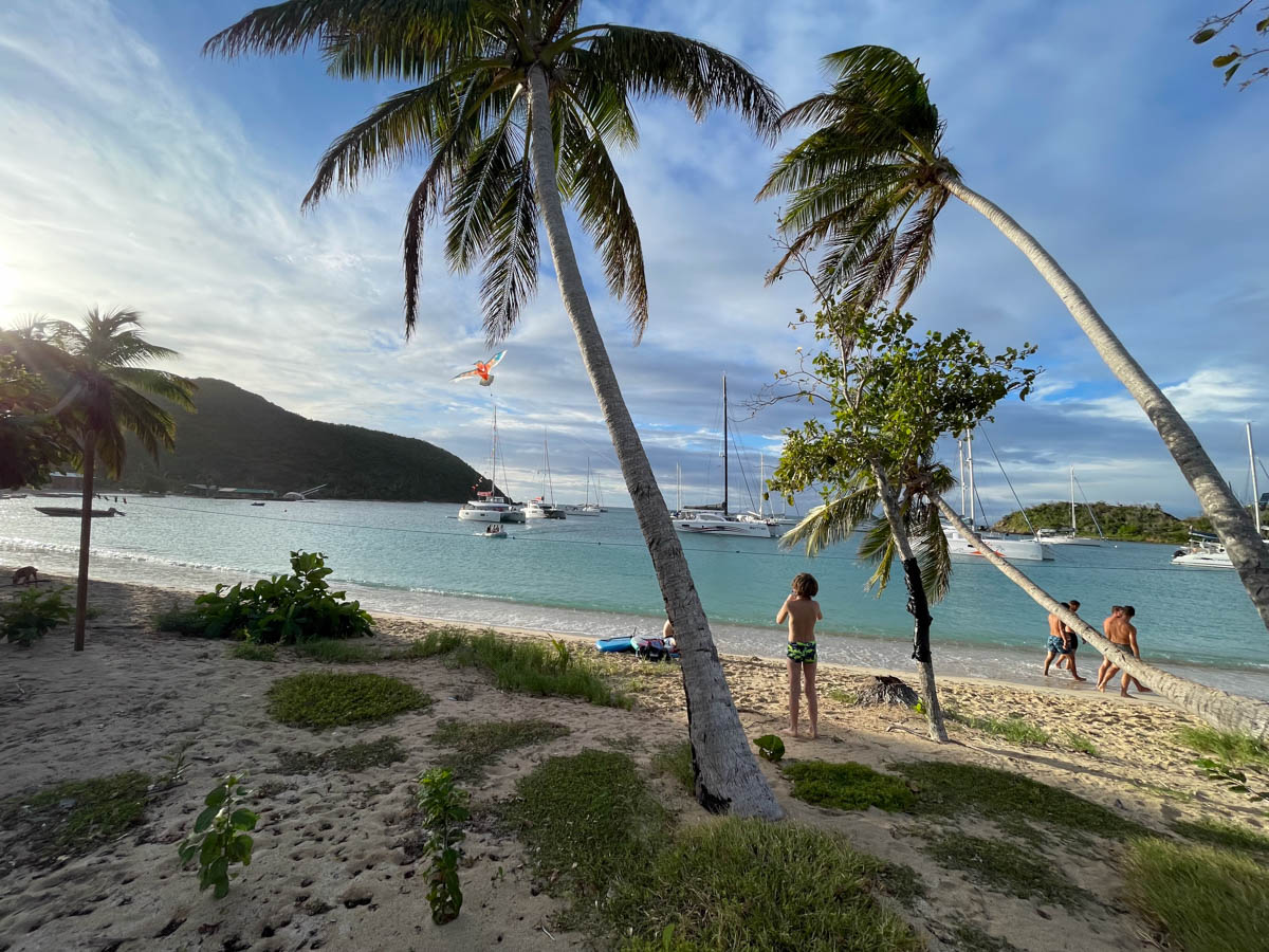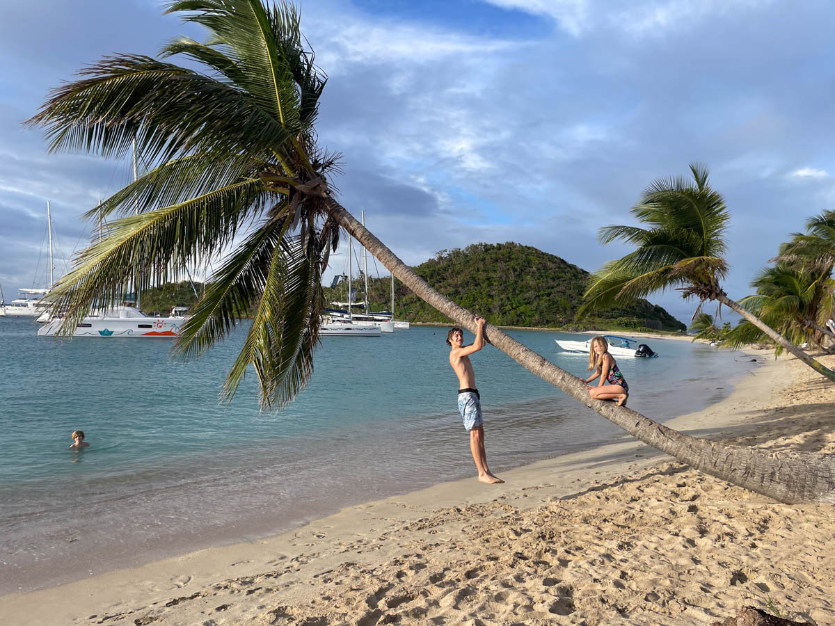 Au matin reprise de l’école. Pour la récréation de Mathilde et Magali elle partent en paddle vers les rochers de l’îlet mais le vent souffle et soulève les vagues, il y a trop de sable en suspension dans l’eau, elles nagent alors jusqu’à la plage pour profiter sur sable à l’ombre des cocotiers. Nous déjeunons au bateau avant de lever l’ancre vers le groupe d’îles des Tobago Cays qui sont entourées d’une barrière de corail.