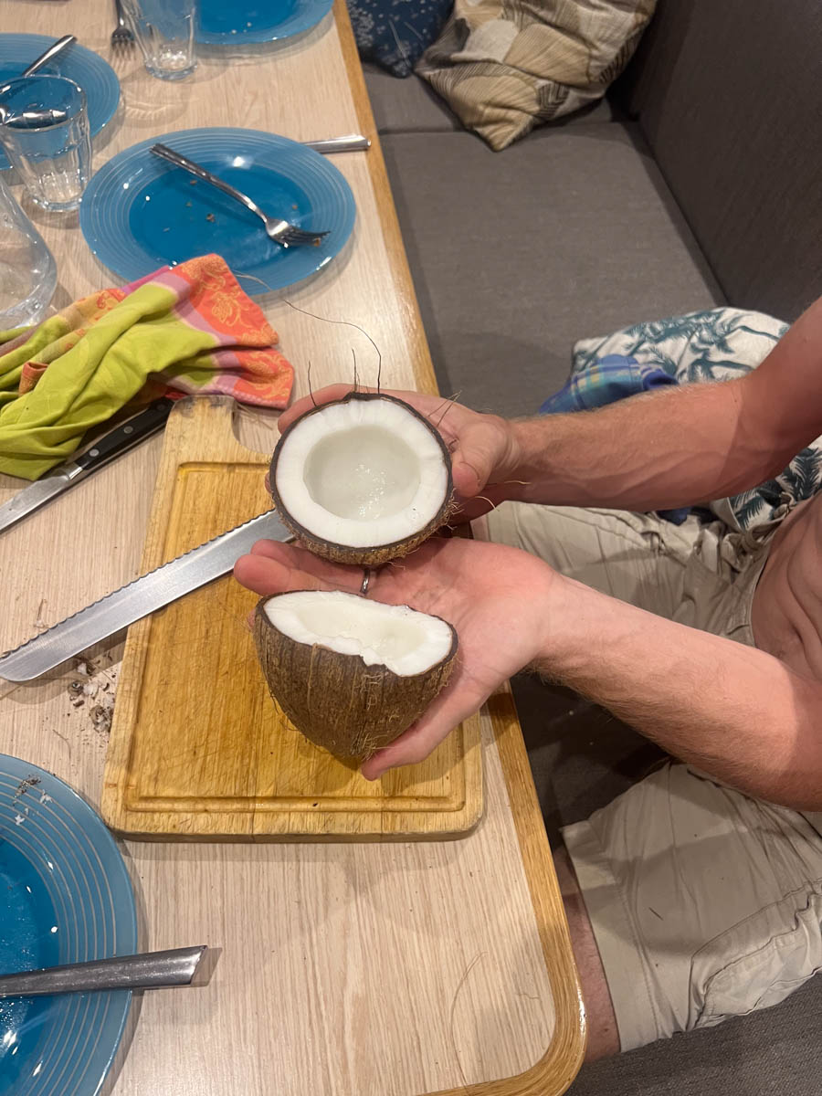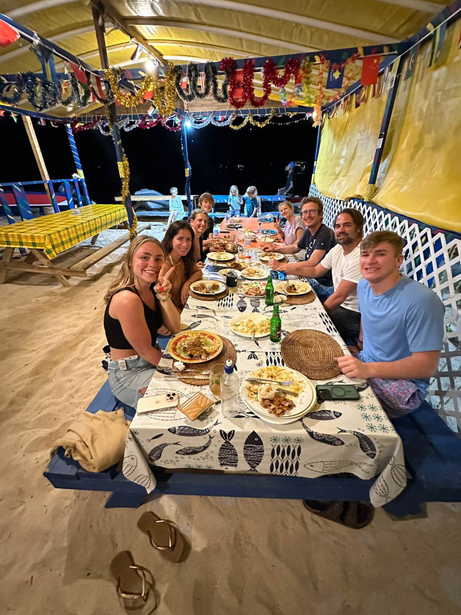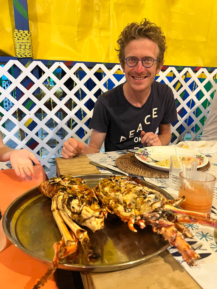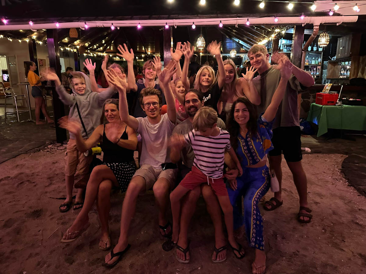Pour le déjeuner Magali tente de cuisiner local avec un curry de bananes plantain et pommes de terre : c’est très bon ! À refaire !Après midi école puis nous avons rendez-vous pour un dernier dîner avec Malea chez Frangipani à 18h. Comme lors de notre premier repas chez eux le service est à la créole (très lent) mais il y a un orchestre et nous patientons en dansant dans le sable.