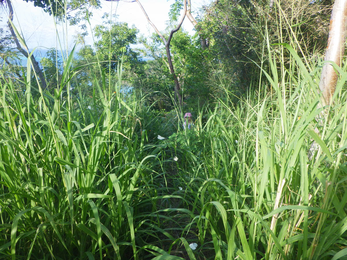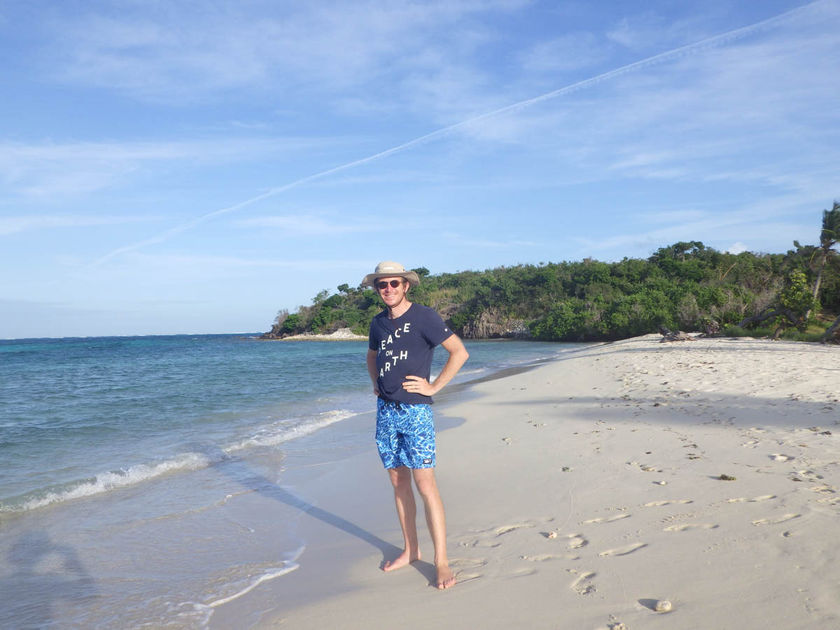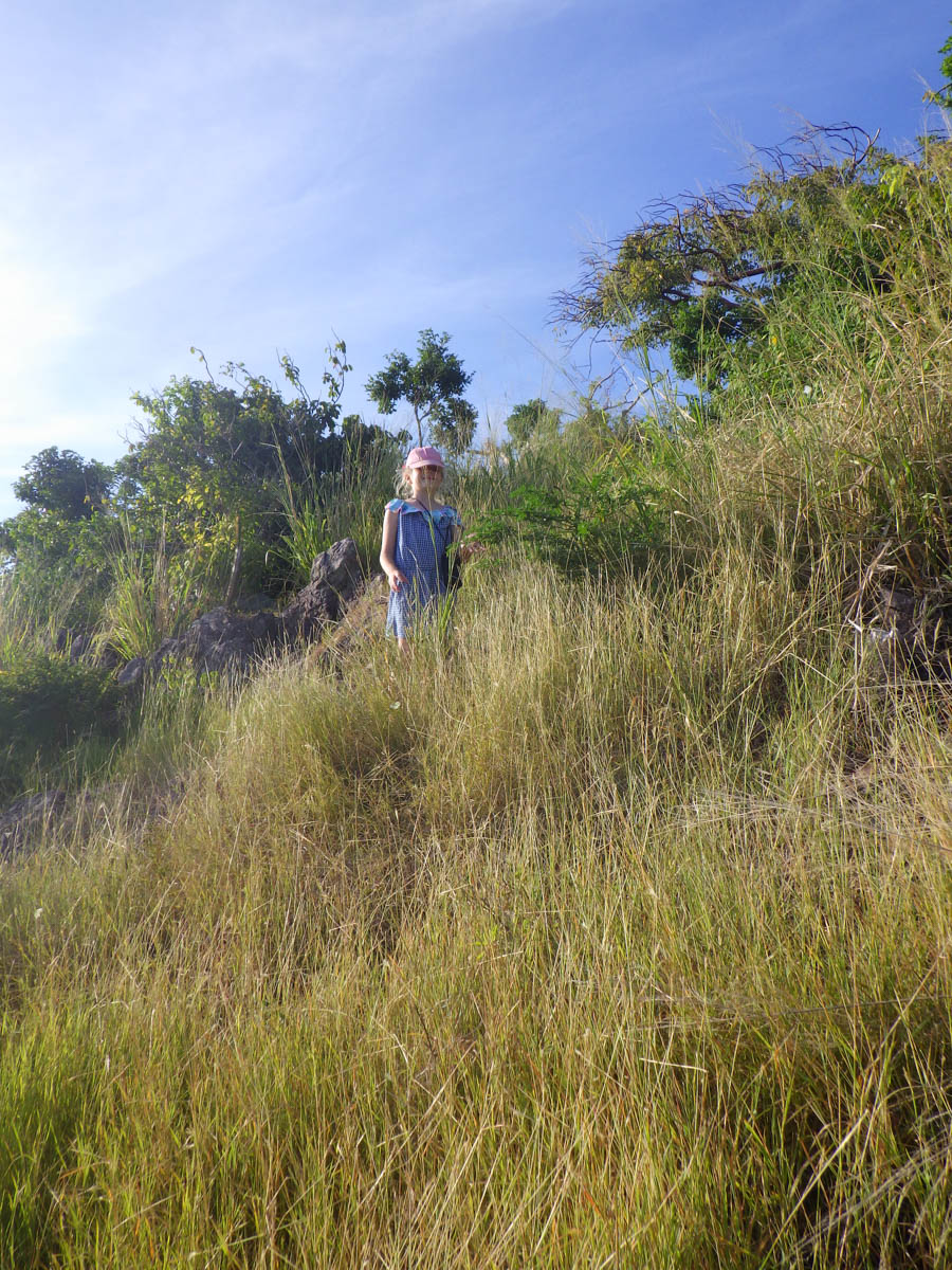 Puis nous allons en annexe sur l’île de Petit Bateau et accostons sur la plage du sud, nous avons pris nos affaires de mini randonnée (tongs, gourdes et bâton de marche de Martin). Nous grimpons l’unique sentier jusqu’au sommet de l’île au milieu des herbes et des papillons blancs. En haut nous admirons la vue sur le mouillage de seulement 10 bateaux devant la barrière de corail. Nous redescendons vers la plage du nord où se trouve les seules « constructions » de l’archipel : une cuisine ouverte avec des barbecue sous un auvent en tôle et des tables de pique-nique autour. Il ne semble même pas y avoir d’électricité. Nous faisons le tour de l’île et revenons vers la plage du sud.