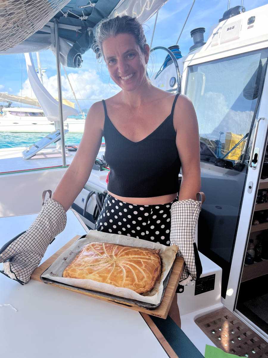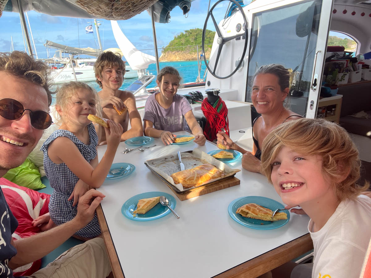 On quitte les Tobago Cays en direction de Canouan, l’île un peu plus au nord. La navigation est tranquille cette fois pas de grains. Nous rejoignons Malea au mouillage de la baie de Rameau. Nous jetons l’ancre sur un fond de sable mais l’eau est trouble remuée par le vent. Il y a quelques nuages qui ne donnent pas envie de se baigner. On reprend un peu d’école et Martin fait un atelier pâtisserie pour le goûter.