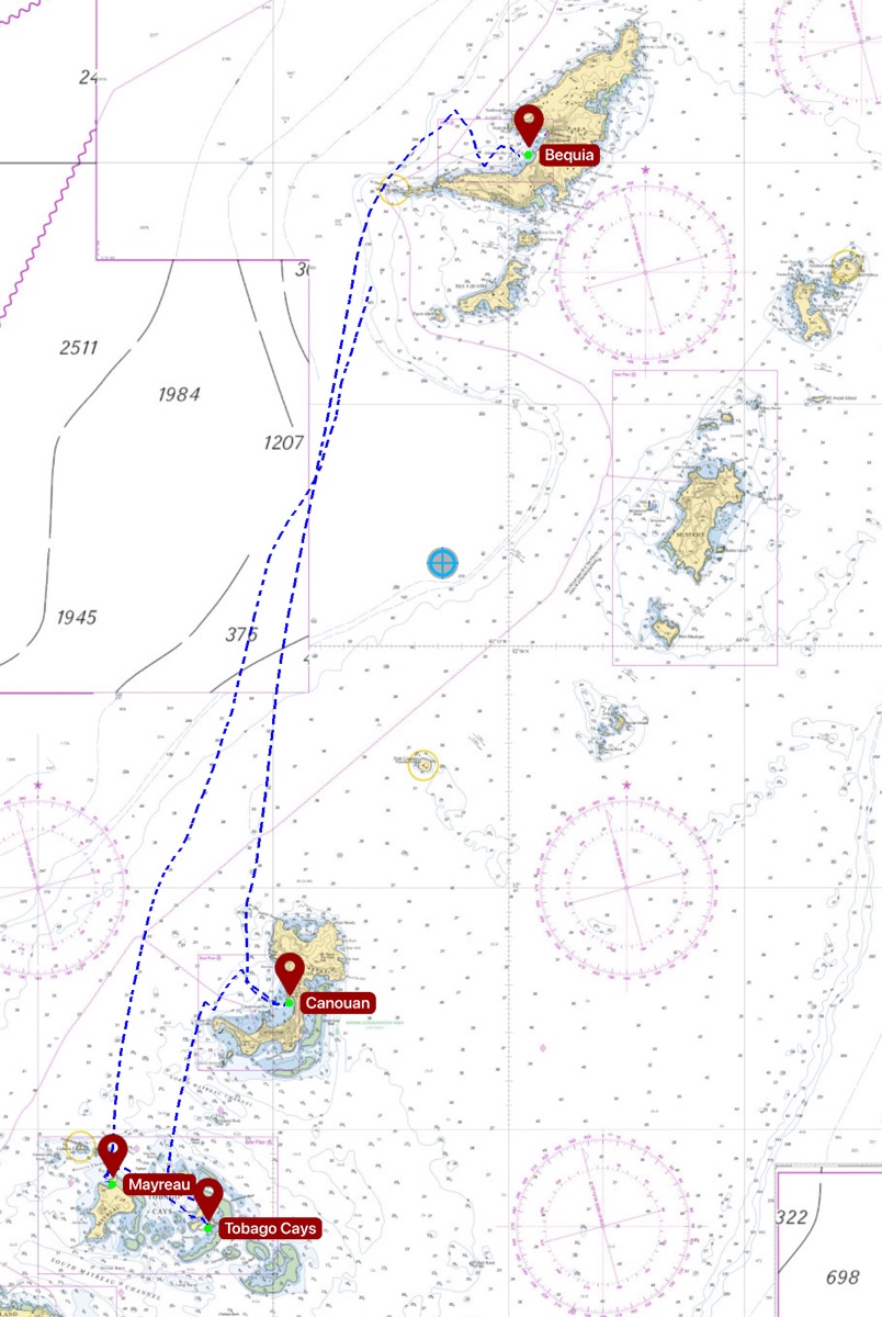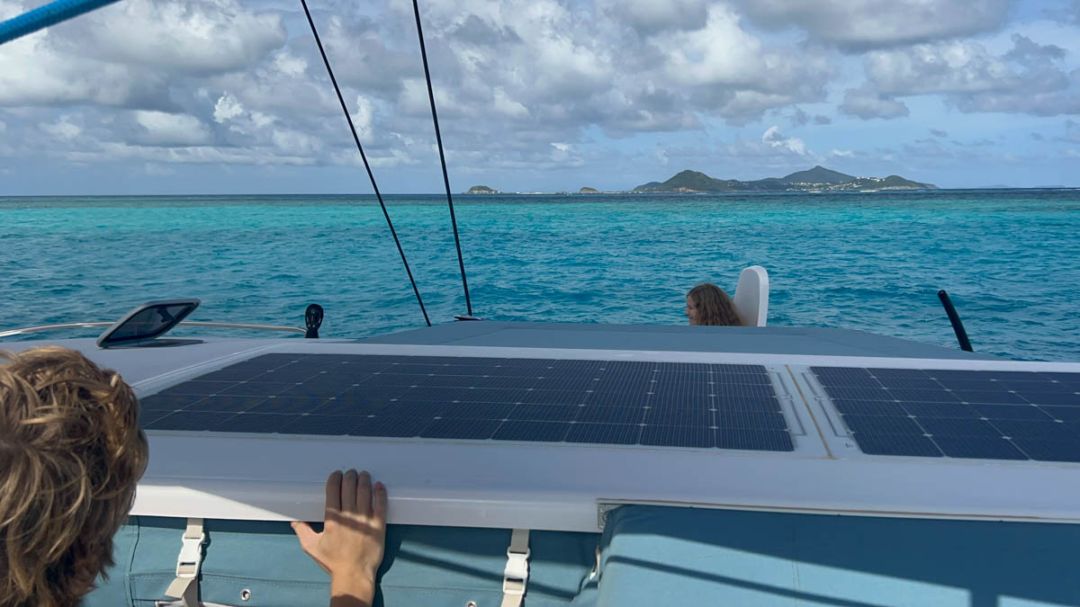 Nous partons de Bequia le 3 janvier vers 11h en route vers Mayreau. Le vent est soutenu autour de 15 nds au portant. Nous partons avec le solent et la grand voile haute. Mais un premier grain arrive avec des rafales plus forte, nous prenons un ris pour être tranquille. La pluie arrive rapidement, nous fermons tous les hublots et le tour de cockpit pour rester au sec. Antoine préfère rester dehors pour surveiller. Il est rapidement trempé alors il enlève son teeshirt et enfile son ciré. Bien au sec ce sera plus agréable ! Les grains s’enchaînent jusqu’à Mayreau.