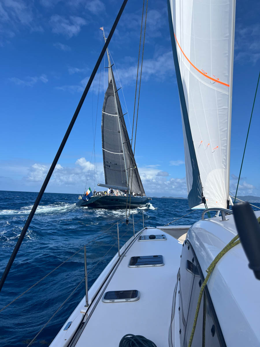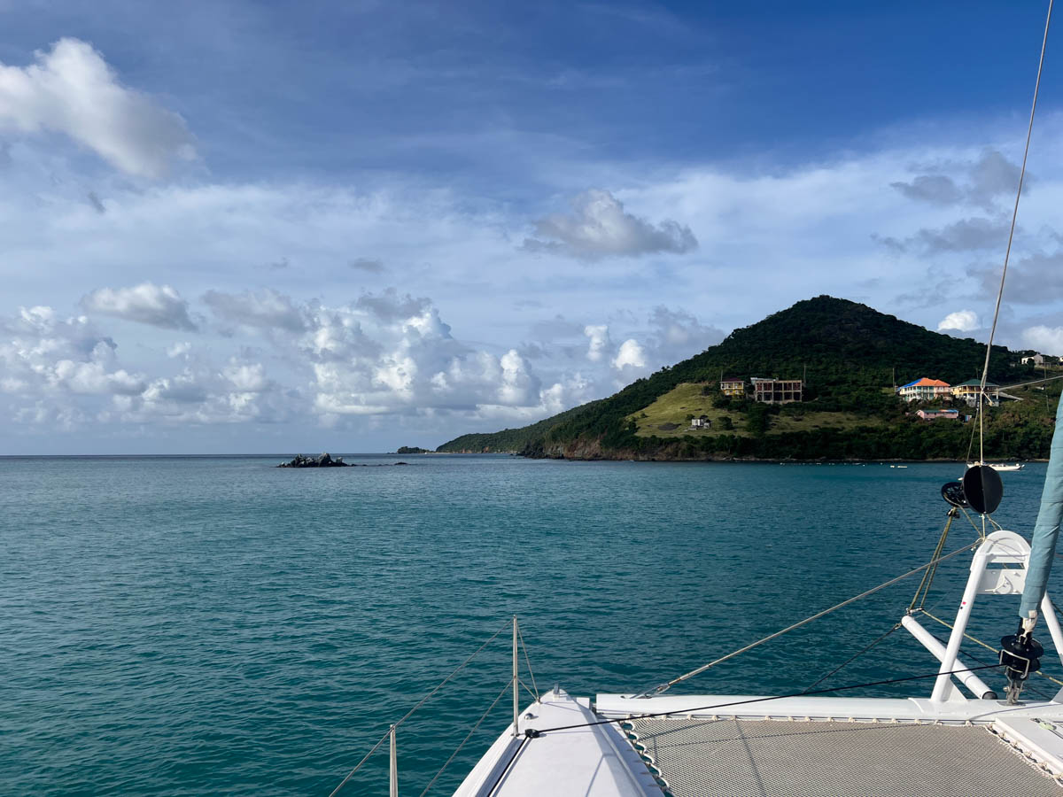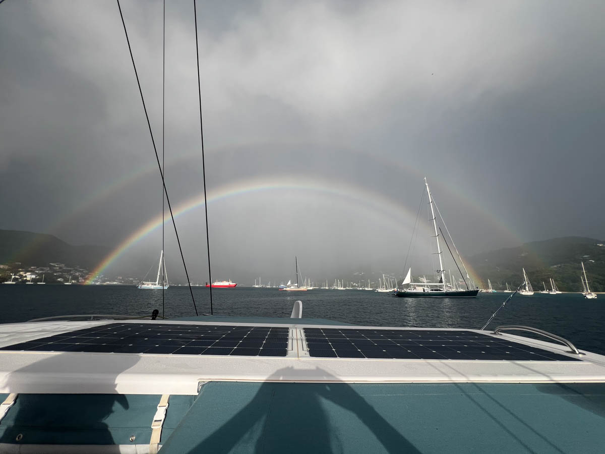 Nous préparons le bateau pour le départ en hissant le code zéro car le vent devrait être tranquille. Au moment où nous appareillons un grain recouvre l’île et nous offre un superbe arc en ciel double pour nos adieux à Bequia : quel beau cadeau !