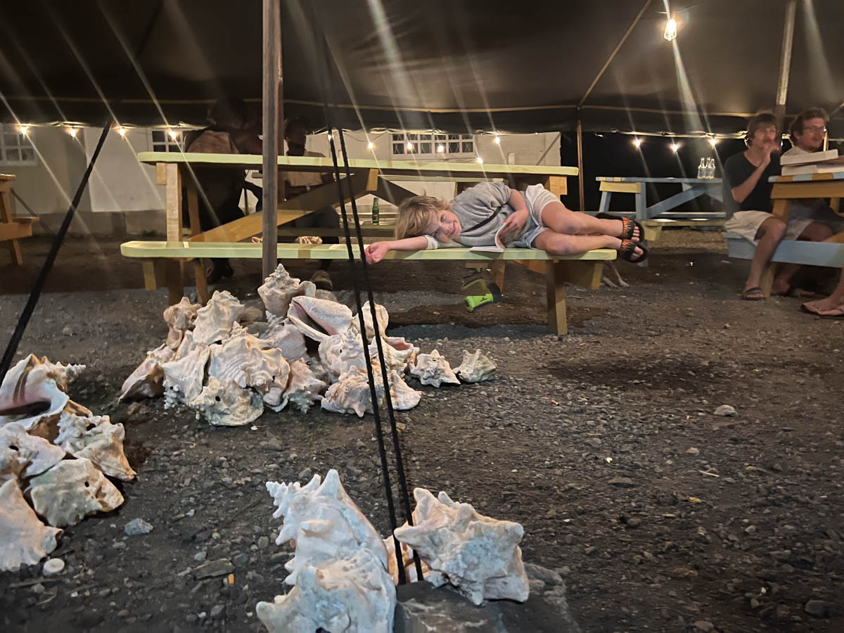 Pour le dîner Malea a repéré un restaurant appétissant. On va en annexe jusqu’au dinghy dock gardé par des pêcheurs. Nous marchons au milieu des tas de tôles en attente de deblayement ou d’utilisation future (dans le noir ce n’est pas clair). Nous remontons une rue de baraquements avec des échoppes jusqu’au restaurant mais c’est fermé. Un local nous appelle un taxi pour aller à la marina où il y aurait des bars ouverts. Mais le taxi n’a que 7 places alors que nous sommes 12 (ça n’a pas l’air de les gêner) et c’est 100$ l’aller ! Entre temps on croise un couple d’européens qui va manger une pizza dans un ancien wagon ferroviaire ! Faute de mieux nous les suivons. C’est tellement petit que nous devons faire chacun nos pizzas avant d’être enfournées dans le four à bois. Nous arrivons à préparer 4 pizzas que nous allons déguster sur une table dehors mais protégée par une tente. Les piquets sont sécurisés par des tas de coquilles de lambi !