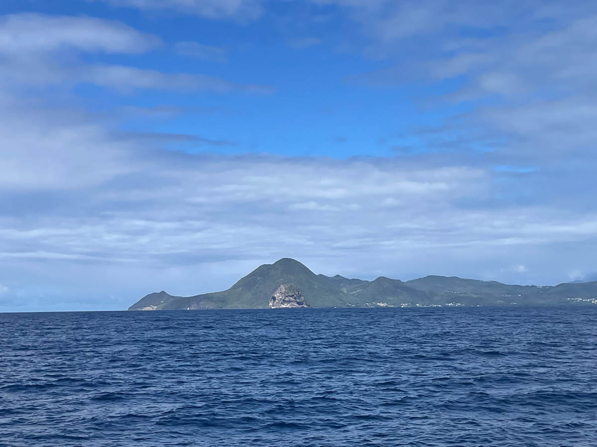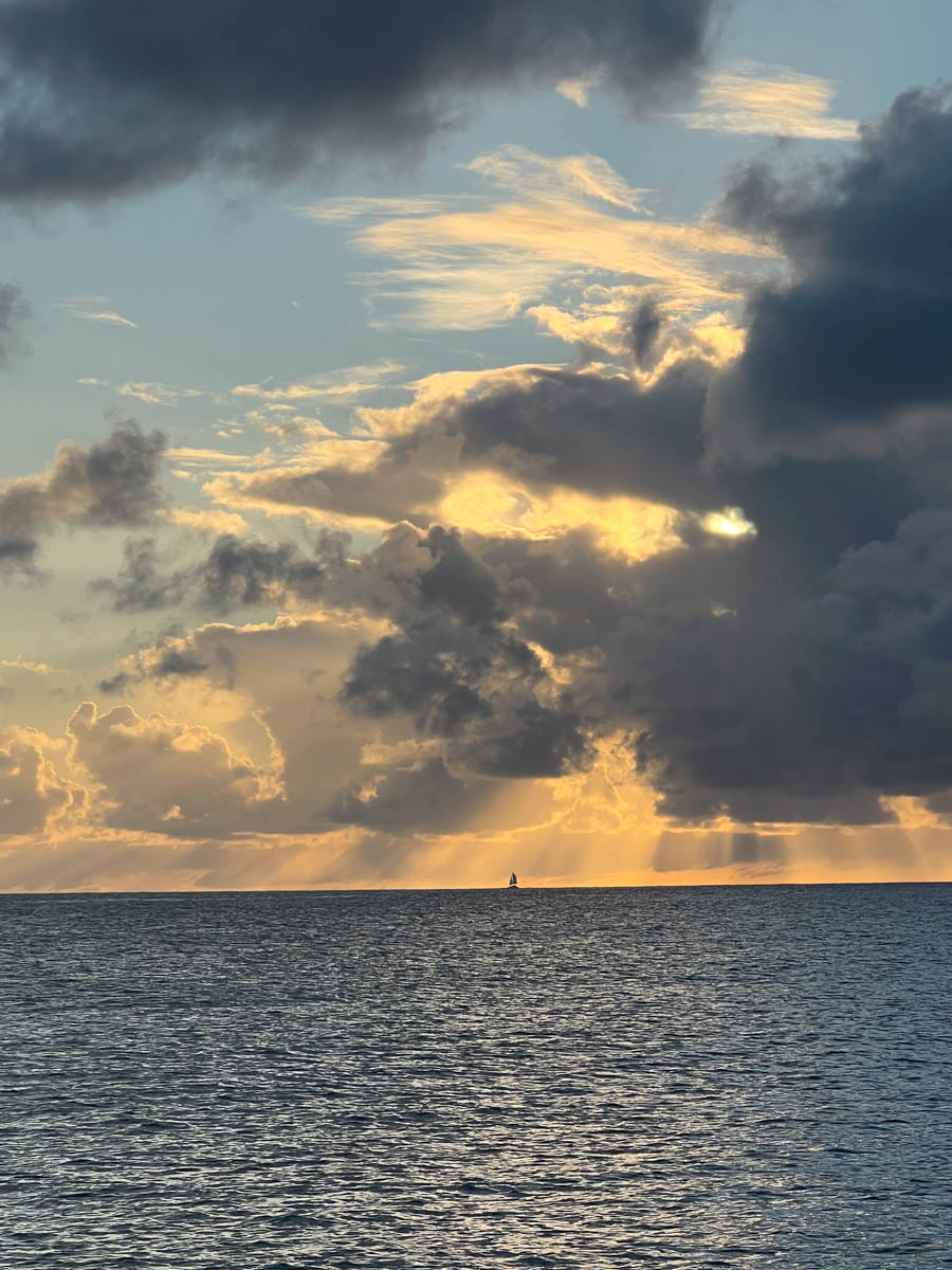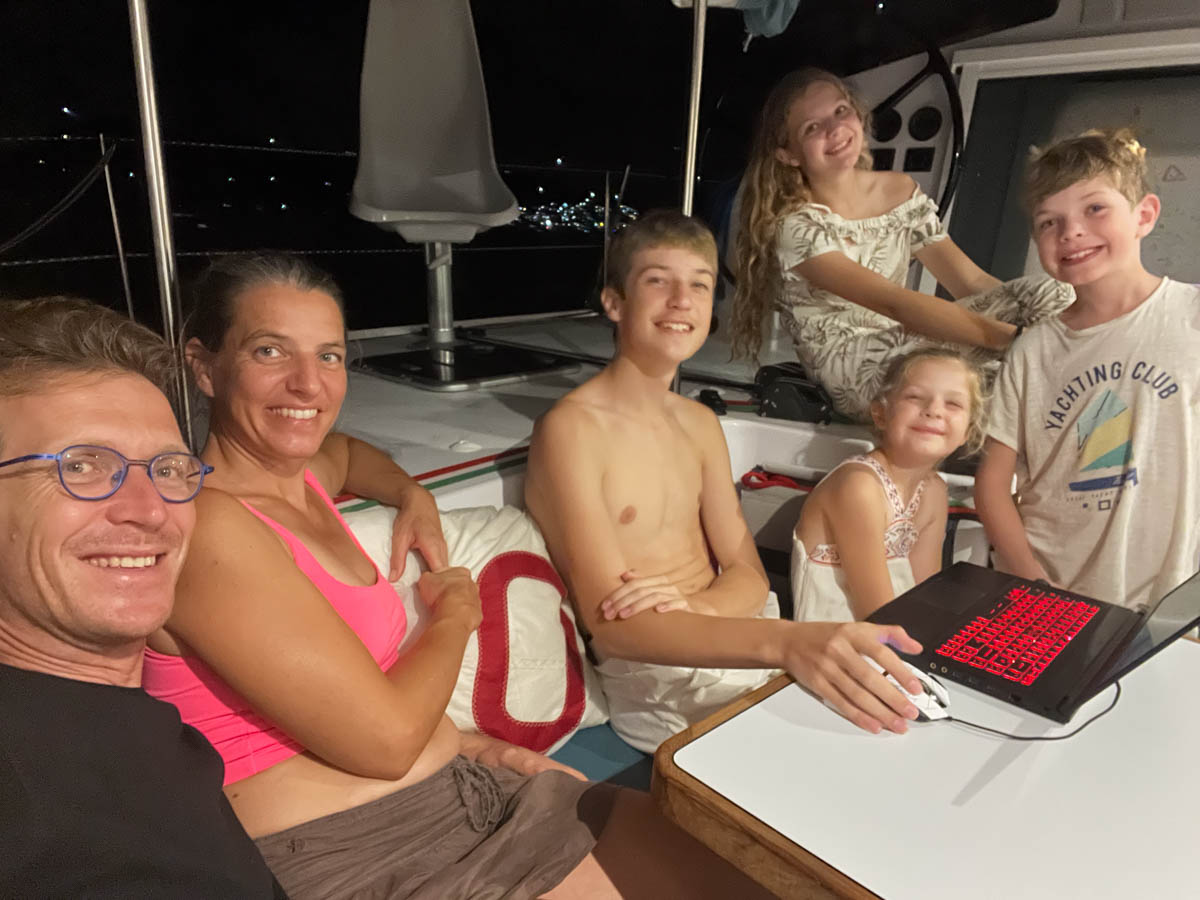 Le vent revient à nouveau pour le dîner, en compagnie d’un groupe de dauphins qui nous distraient puis retombe une heure après. Nous déroulons à nouveau le code zéro pendant le quart des ados et avançons à plus de 7 noeuds pendant 3h ! Puis Magali récupère un renforcement du vent qui fait que nous passons sous solent un peu avant 4h du matin. Mais le vent retombe et Antoine repasse sous Code zéro à 5h du matin. A 7h, nous arrivons dans le dernier canal entre Sainte-Lucie et la Martinique et le vent forcit à nouveau, nous repassons sous Solent mais en fait c’est juste l’effet de la pointe et le vent retombe à nouveau et nous repassons à nouveau sous code zéro.