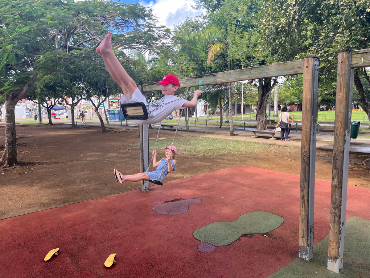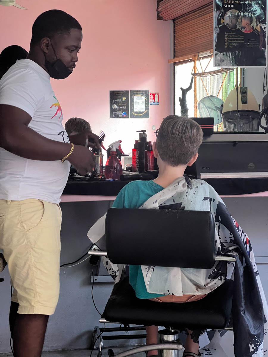 Mardi matin Antoine et Alice vont donc au cabinet médical, ils font une heure et demie de queue sous une terrasse couverte avec vue sur un jardin luxuriant de fleurs et de bananiers (C’est mieux que nos salles d’attente de métropole avec du linoléum gris et des ficus défraîchis). Le médecin confirme que c’est soit une entorse soit une fracture et que nous avons fait la bonne attelle. Il n’y a qu’à attendre entre 1 et 4 semaines en fonction de la gravité du choc. Nous revoyons donc notre programme de randonnée en Dominique par des escales plages en Martinique. L’après-midi Arthur et Martin vont chez le coiffeur pour faire raccourcir leur cheveux qui ont bien poussé depuis juillet ou septembre et qui donnent trop chaud.