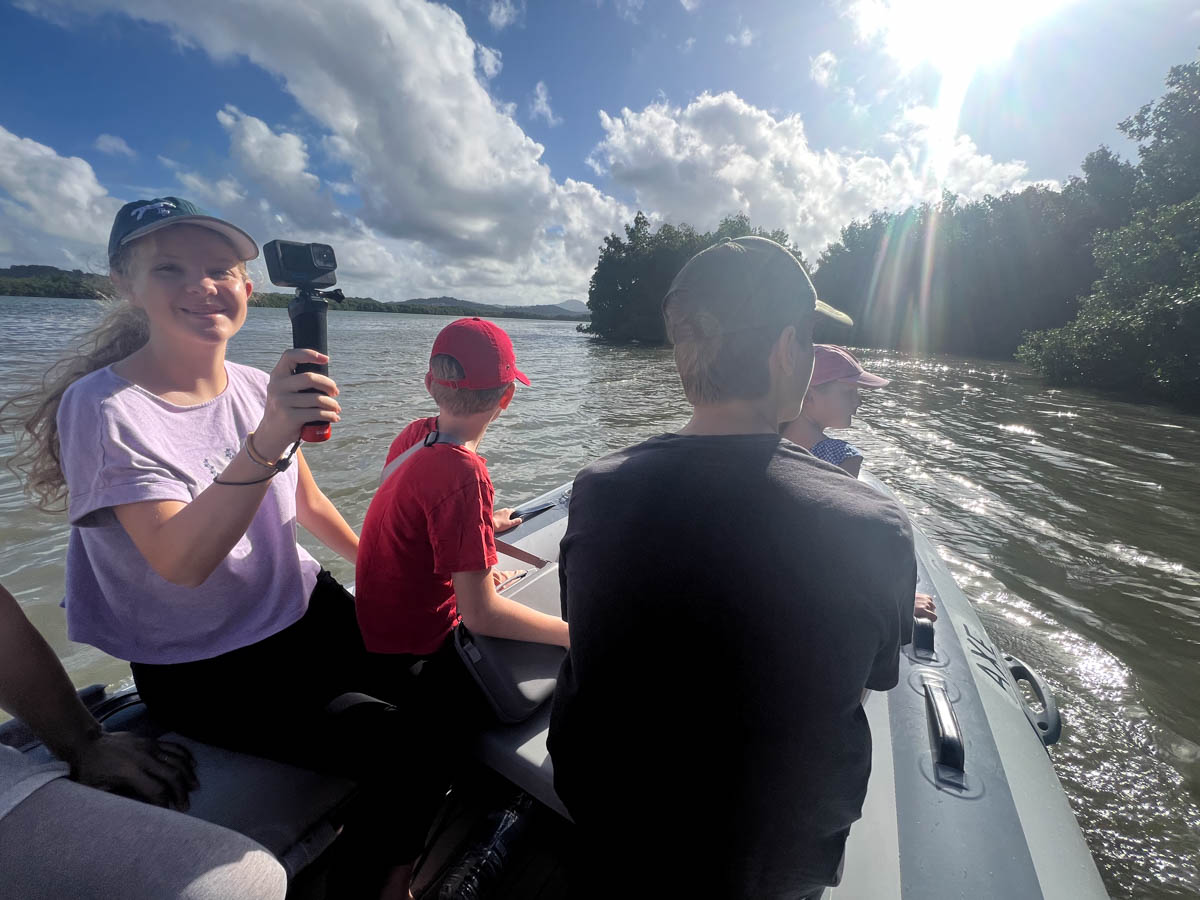 Samedi matin nous nous levons très tôt (7h30) pour aller visiter la mangrove en annexe. Nous pouvons découvrir la rivière salée qui est un canal d’eau saumâtre au milieu des palétuviers. Nous suivons la rivière entourés de racines aériennes sur lesquelles une multitude de crabes se nichent. Des sortes de hérons blancs s’envolent devant nous tout le long. Des poules d’eau noires et rouges nagent sur les bords. Nous ne pouvons pas rejoindre le vieux canal car des arbres nous barrent la route. Nous faisons demi-tour et traversons le bras de mer vers le vieux canal, mais là encore nous serons arrêtés au bout de 50m par des arbres tombés.