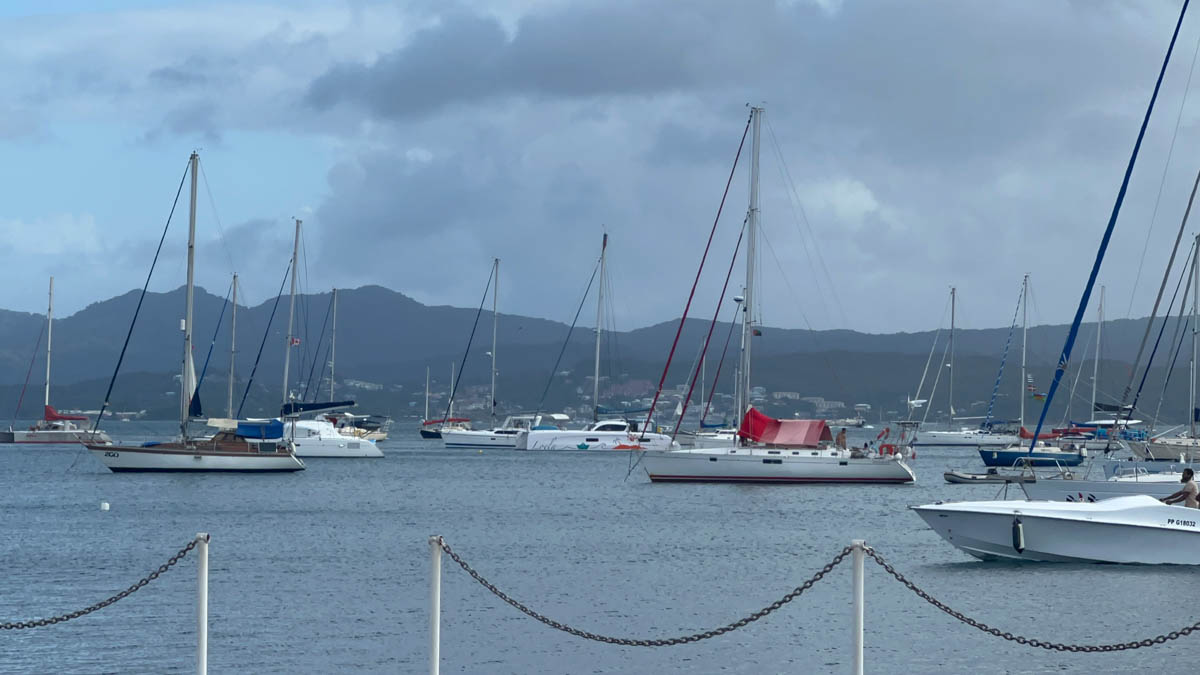 Dès le départ, nous sommes cueillis par un premier grain qui nous accélère à 10nds avant de nous faire retomber à 3nds au bout de quelques minutes. Le vent est très instable en force et en direction à cause de deux facteurs. D’une part, les grains et les nuages apportent leur lot d’accélération puis de ralentissement, et d’autre part, nous passons « derrière » l’île de Saint-Vincent puis de Sainte-Lucie et les vents ont du mal à passer « par-dessus ».