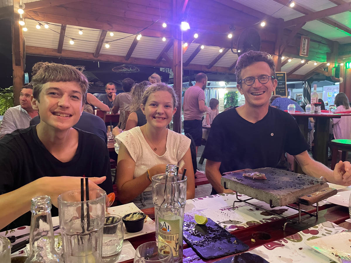 Le soir rendez-vous sur Loela pour un dîner partagé. Paul nous cuisine le thazard qu’il a pêché : nous nous régalons !
