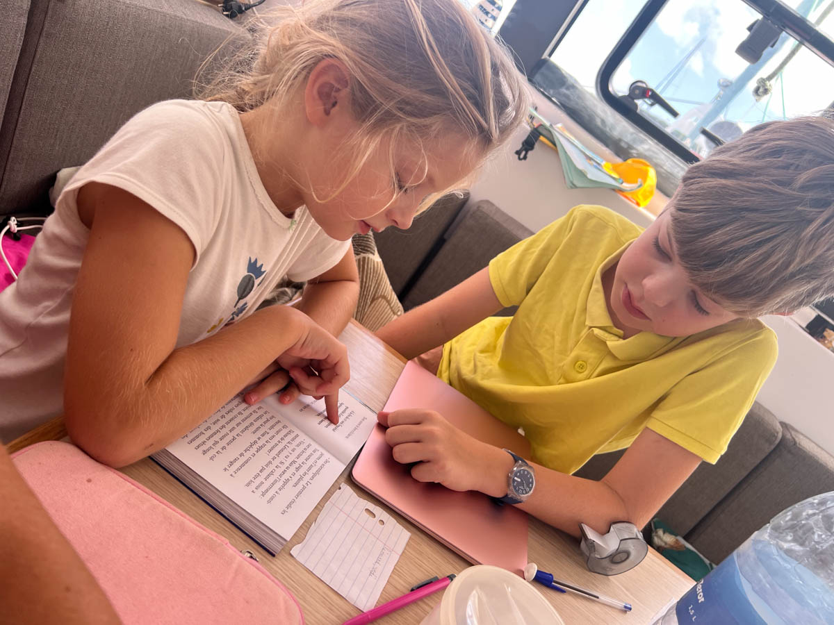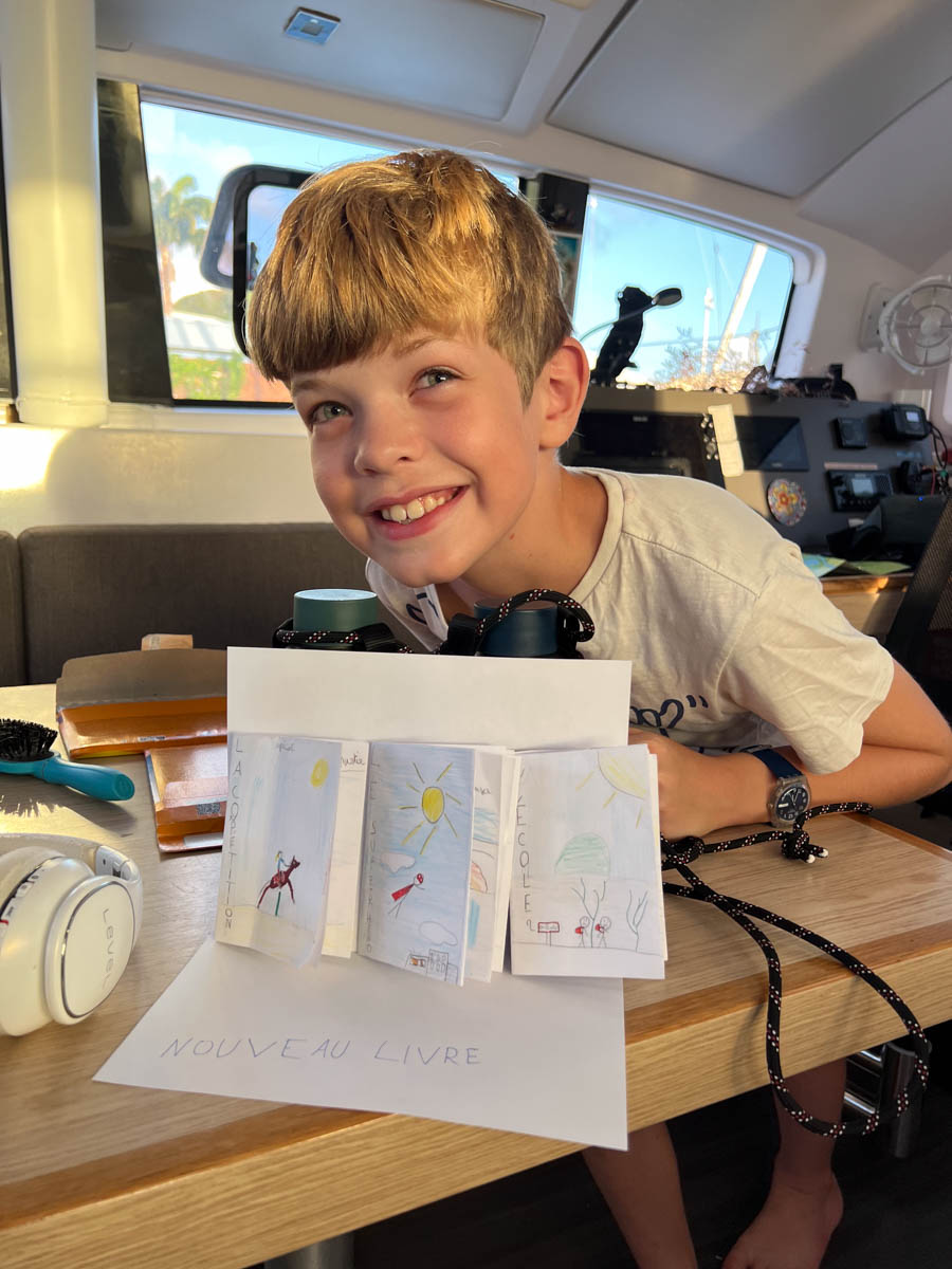 Vendredi 7 février, les choses avancent un peu : l’antenne est remise et l’électricien rebranche correctement le feu. Un ouvrier vient refaire les joints, mais Magali lui fait remarquer que ça ne sert à rien de faire les joints autour de l’épontille avant de remettre le film sur l’epontille elle-même sauf s’ils aiment travailler 2 fois … Ils comprennent enfin ce qu’il faut faire pour remettre d’aplomb les choses! Cependant le fournisseur qui posera le covering sur l’épontille ne peut le faire dans la journée. Nous sommes donc bloqués là jusqu’à lundi … 😞 Nous nous remettons à l’école et Martin écrit des livres que vous pouvez découvrir dans les photos ci-dessous !