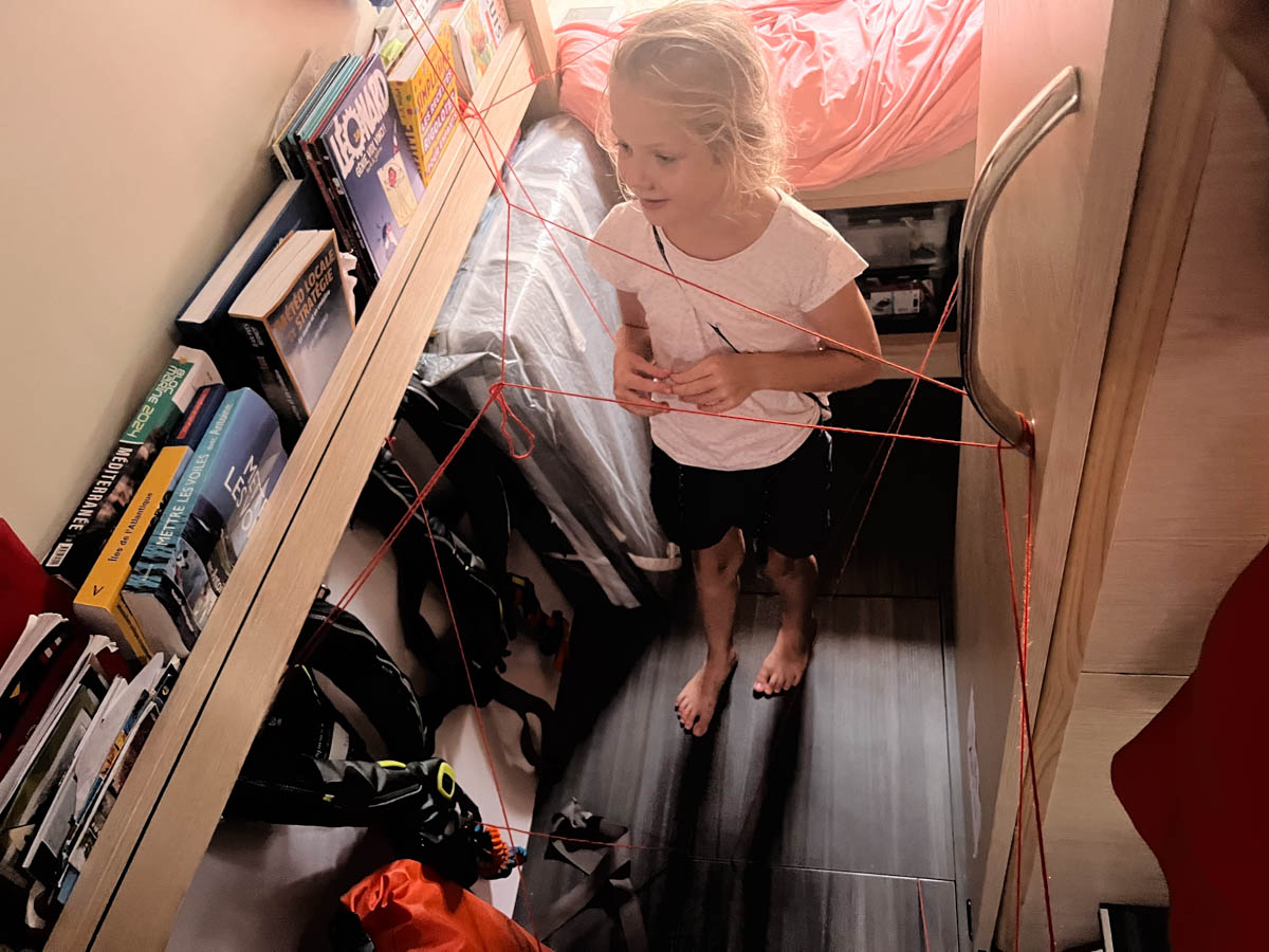 Dimanche 9 février Martin organise une chasse au trésor à bord. Antoine, Magali et Mathilde décodent les messages et vont de cachette en cachette jusqu’au trésor dans les cales du bateau. C’est grasse matinée pour les ados. Nous profitons ensuite de la belle luminosité pour vider toute la coque des enfants afin de prendre des photos pour l’annonce de vente de Loela. Ça nous prend bien 2h30. Après déjeuner il faut encore tout remettre en place pendant qu’Antoine fait la sieste et Magali cuisine des cheesecakes. À 17h30 il est temps de revenir au ponton de la marina du Marin pour mettre la pression au chantier afin de finir les finitions de filmage et joints.