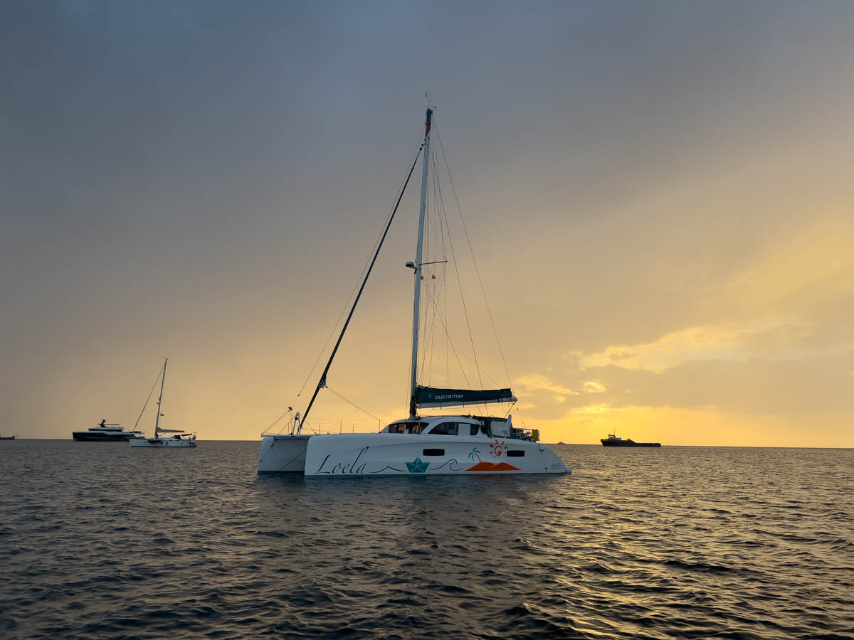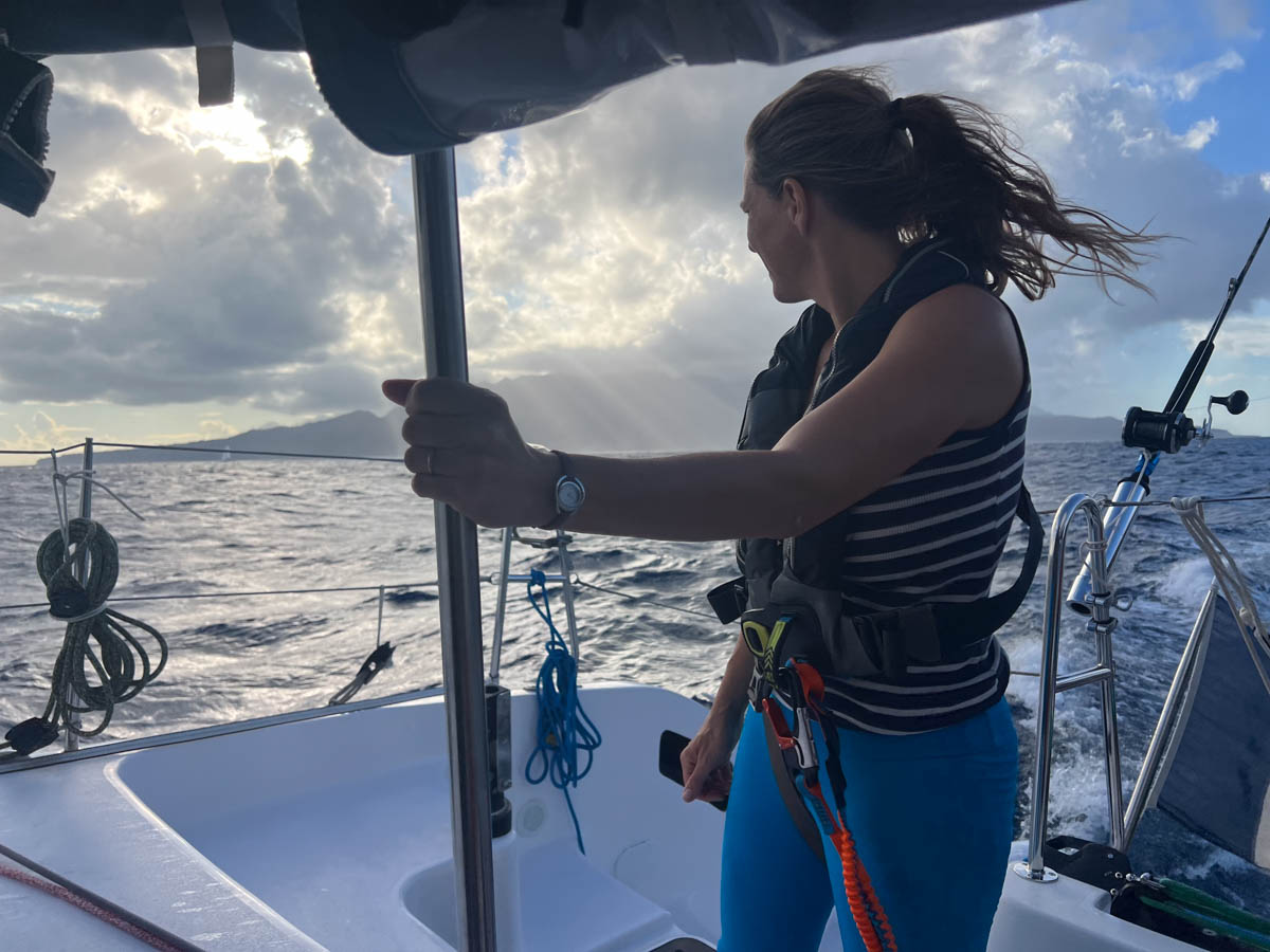 Mercredi 19, réveil 5h30 pour partir à 6h de Saint Pierre au lever du soleil. Il n’y a pas de vent jusqu’à la pointe nous partons au moteur puis nous glissons sur la mer plate sous voile. Arrivés à la pointe nord de la Martinique le vent et les vagues se lève. Nous filons à vive allure dans le canal à une moyenne de 11 noeud, nous déposons un autre cata parti en même temps que nous. Le vent rafale beaucoup jusqu’à 34 nœuds. Nous prenons 2 ris dans la grand voile et un ris dans le solent quand ça monte trop. À 10h nous abordons l’ouest de la Dominique avec ses hautes montagnes. Entre la montagne Pelée de la Martinique et les sommets de la Dominique nous comprenons pourquoi le vent s’engouffre et accélère beaucoup entre les 2.