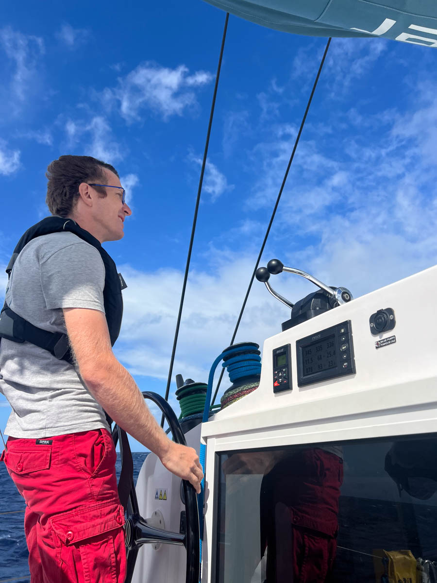 Une heure après Antoine voit des bidons flottants signalant un casier, il essaie de l’éviter mais le bout est tellement long qu’il flotte sur une grande distance. Et bien sûr nous nous le prenons sous la coque du bateau. Nous traînons 3 bidons et certainement le filet qui va avec. Magali arrive à remonter les bidons sur la jupe arrière mais le bout est coincé dans le safran bâbord… il va falloir plonger pour le décoincer! Nous réveillons Arthur pour maintenir le bateau face au vent et tenter de s’arrêter mais il y a trop de vent et le safran bloqué empêche de diriger le bateau. Nous ne pouvons démarrer le moteur car le bout risque de s’emmêler dans les hélices. Nous affalons les voiles pour nous arrêter et se laisser dériver.